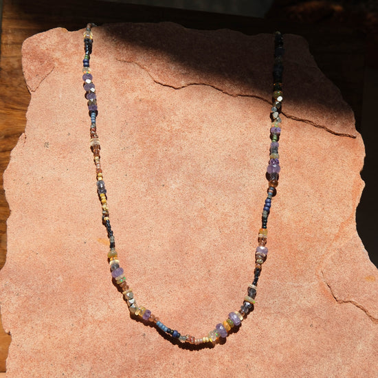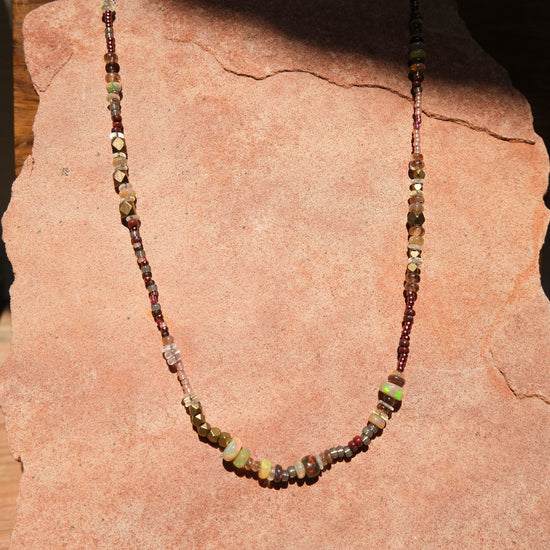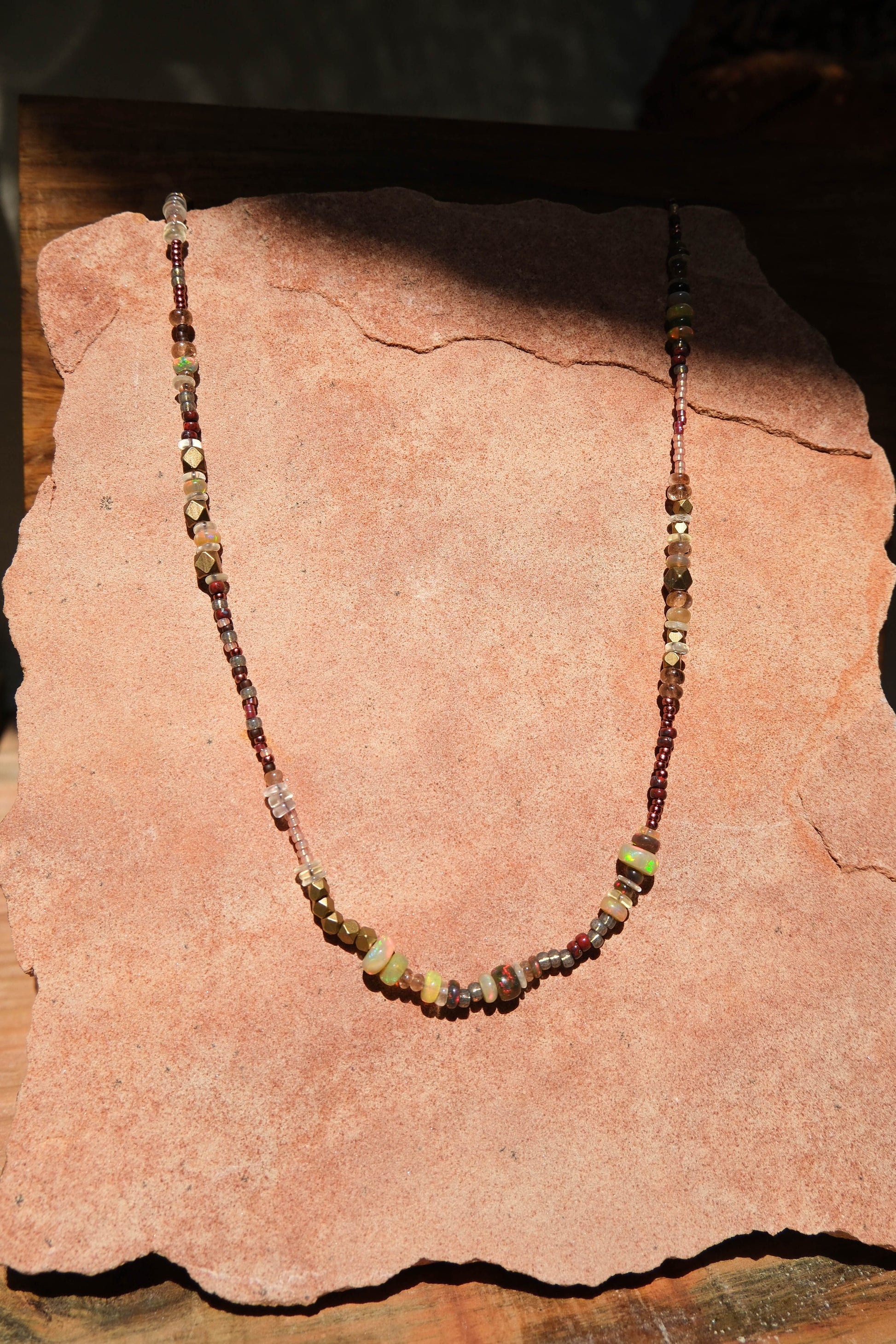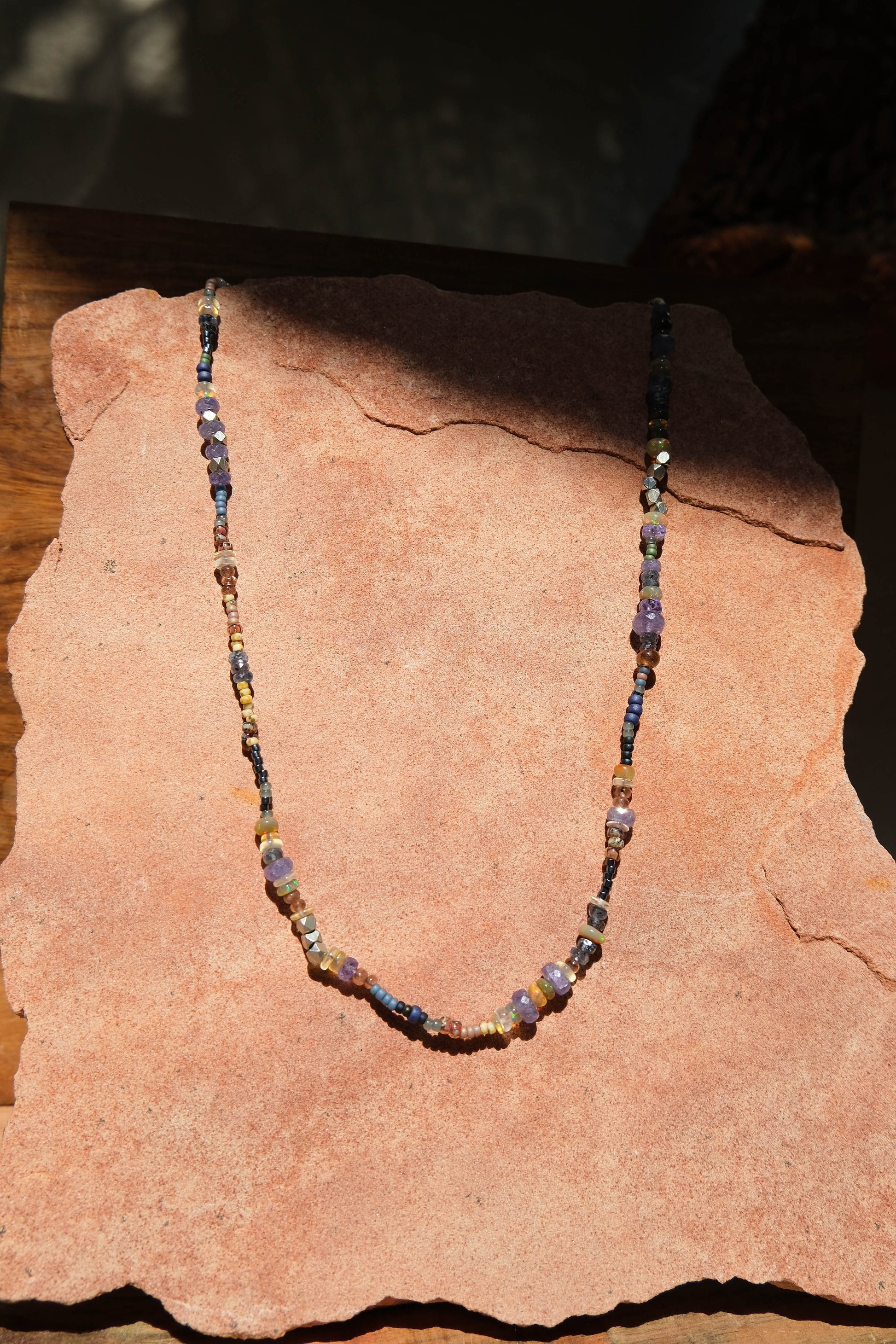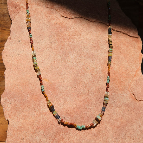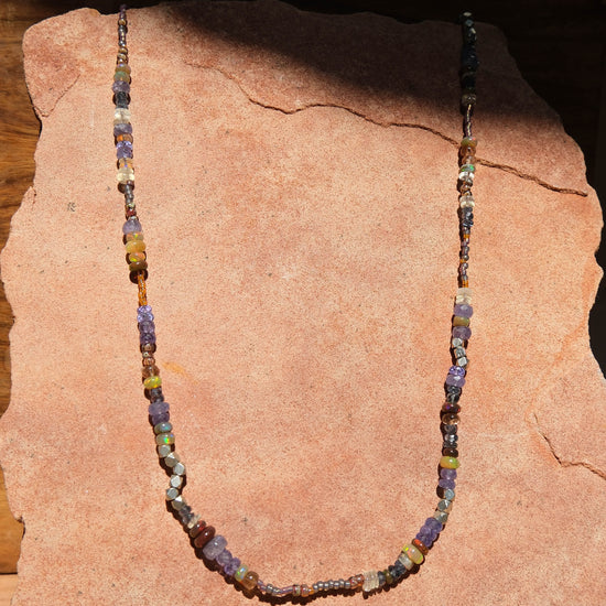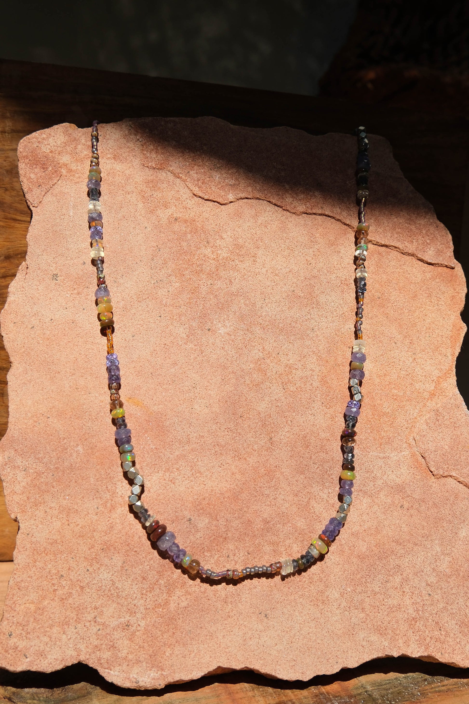 Glass, seed beads, and semi-precious stones: Opal, Hessonite Garnet, Kyanite, Tanzanite, Chrysoprase, Turquoise & Andalusite.