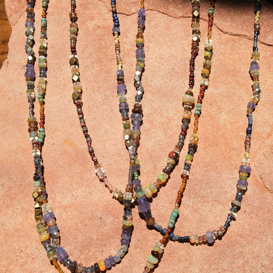 Strung bead by bead, these one-of-a-kind necklaces were handcrafted by Elizabeth Cronin as a way to stay grounded and creative. Each is entirely unique—woven with mixed, semi-precious stones, and intention.