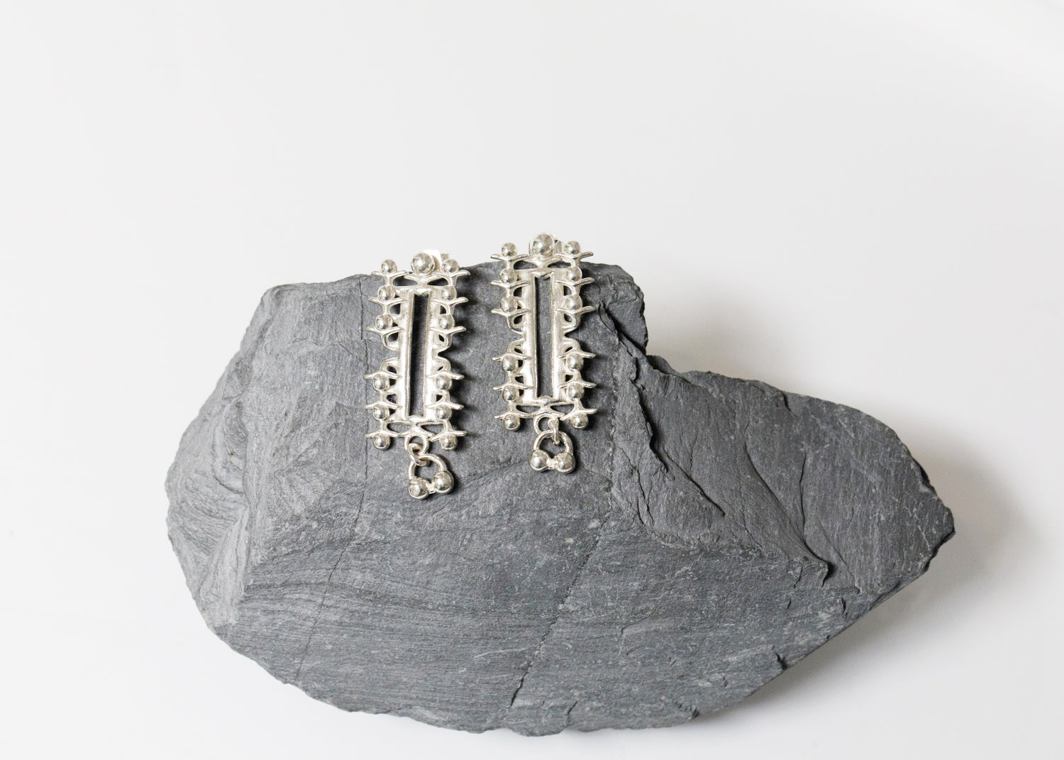 A bold interplay of geometry and ornament, the Sterling Structure Earrings from Bravais Lattice are wearable sculptures. Handcrafted in solid sterling silver, these statement earrings feature a vertical architectural form flanked by symmetrical rows of polished spheres, evoking a futuristic yet organic structure.