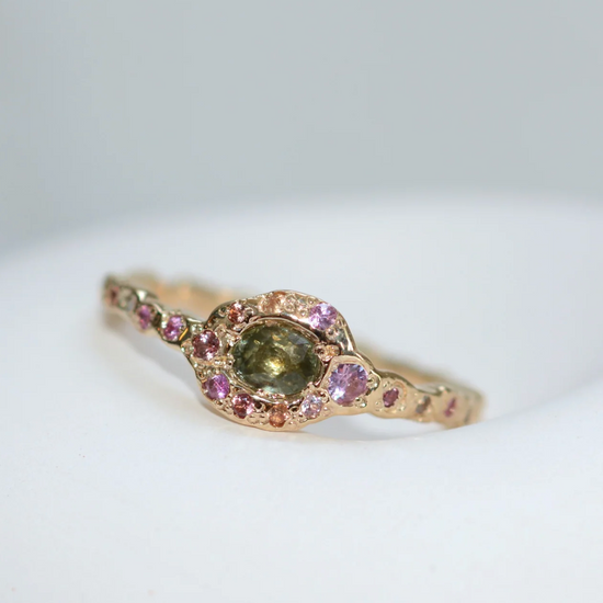 - Green sapphire surrounded by a mix of minty green, vibrant pink, blush pink, light blue, lavender and peach sapphires
