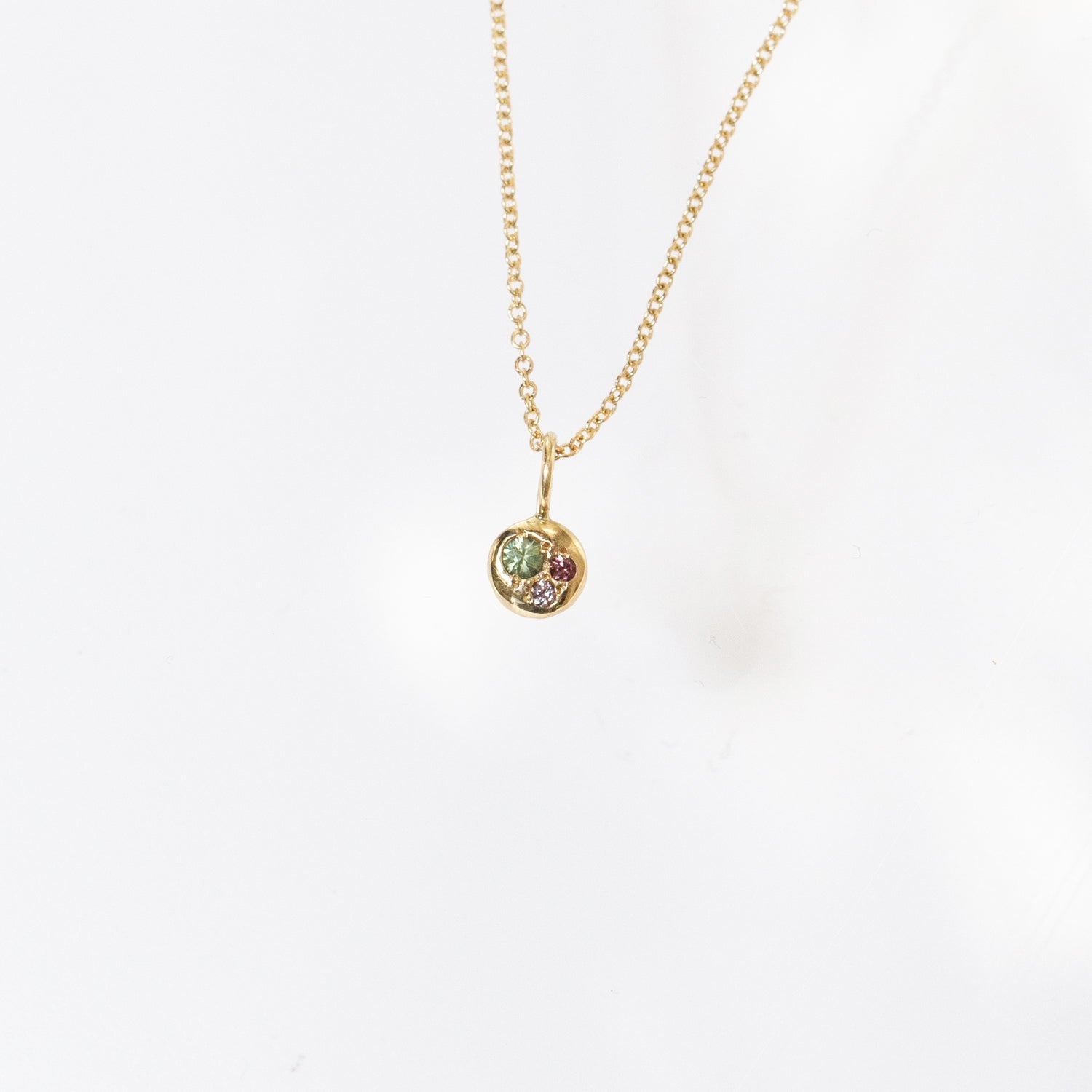 Small in size, big in brilliance. This one-of-a-kind pendant features three sapphires—pink, blue, and rose—set in solid 14k gold. It hangs from an adjustable 14k gold chain and adds the perfect touch of everyday elegance.