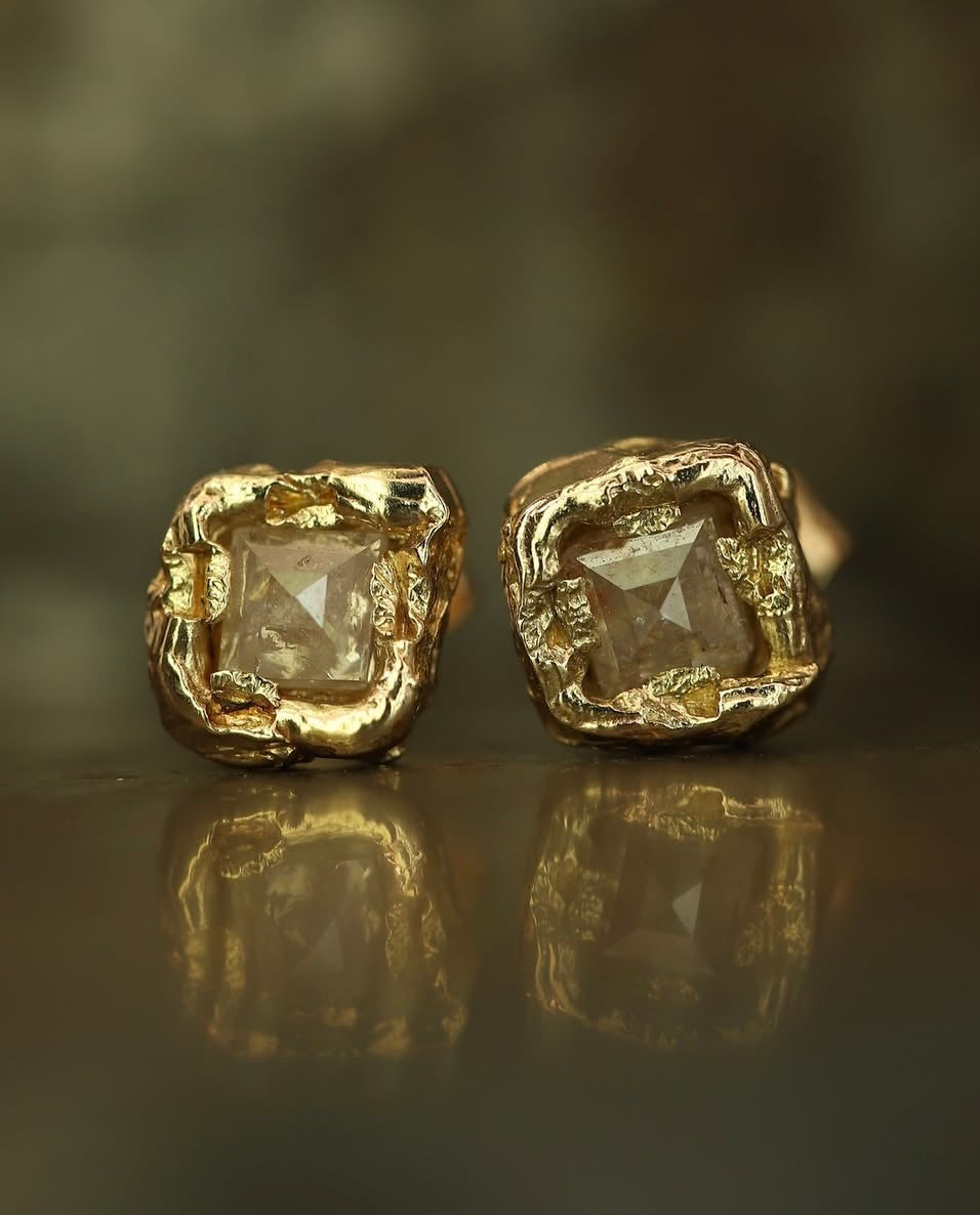 Rose-cut pale rust diamonds set in 14k yellow gold. The bezel is textured by hand, inspired by Scottish landscapes and ancient metalwork. Understated, with depth and detail you’ll notice up close.