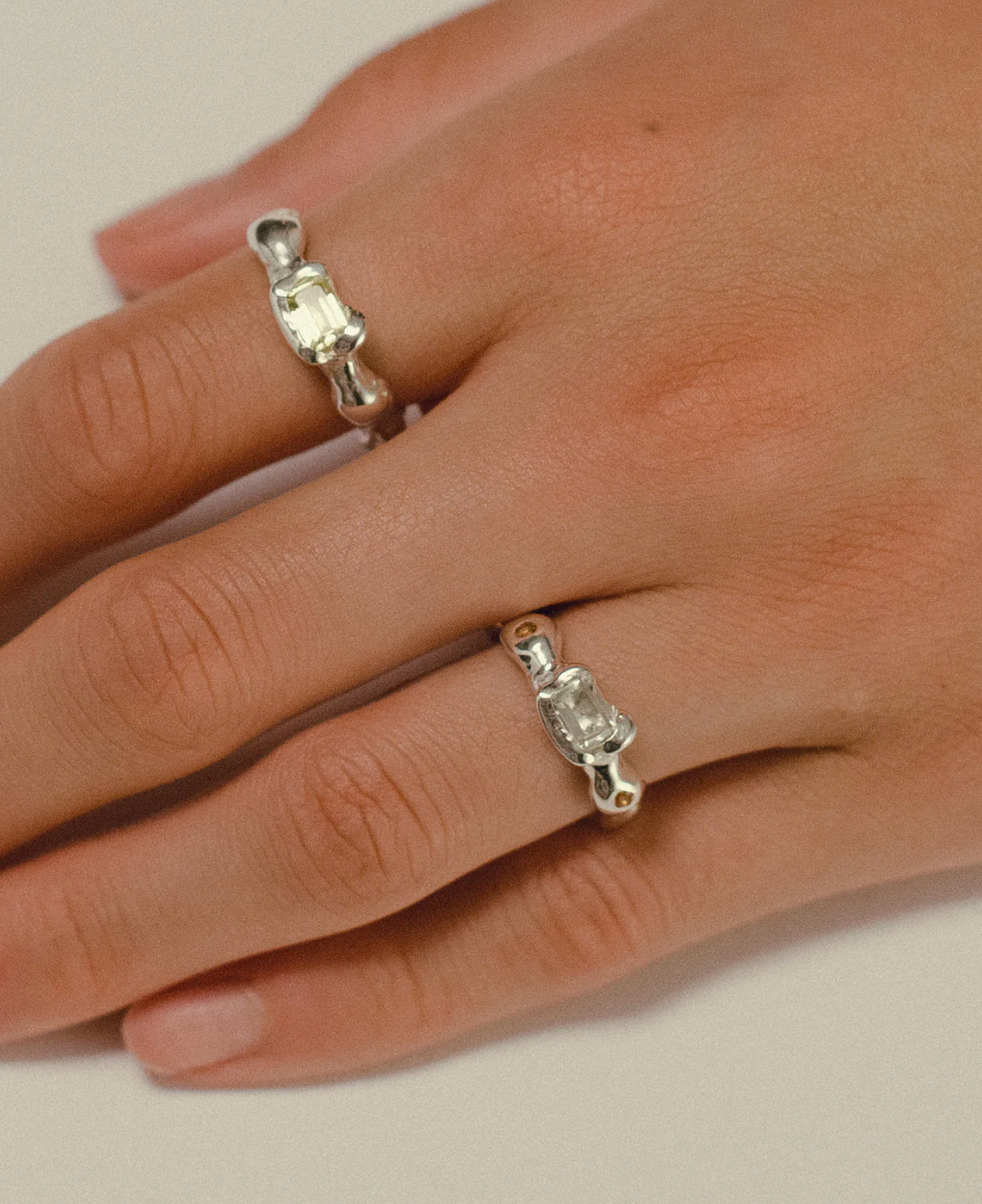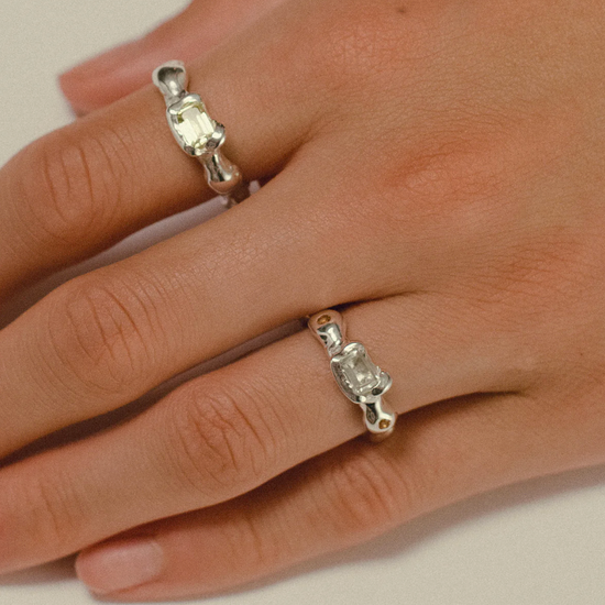 A center emerald cut gemstone complimented with two adjacent stones.