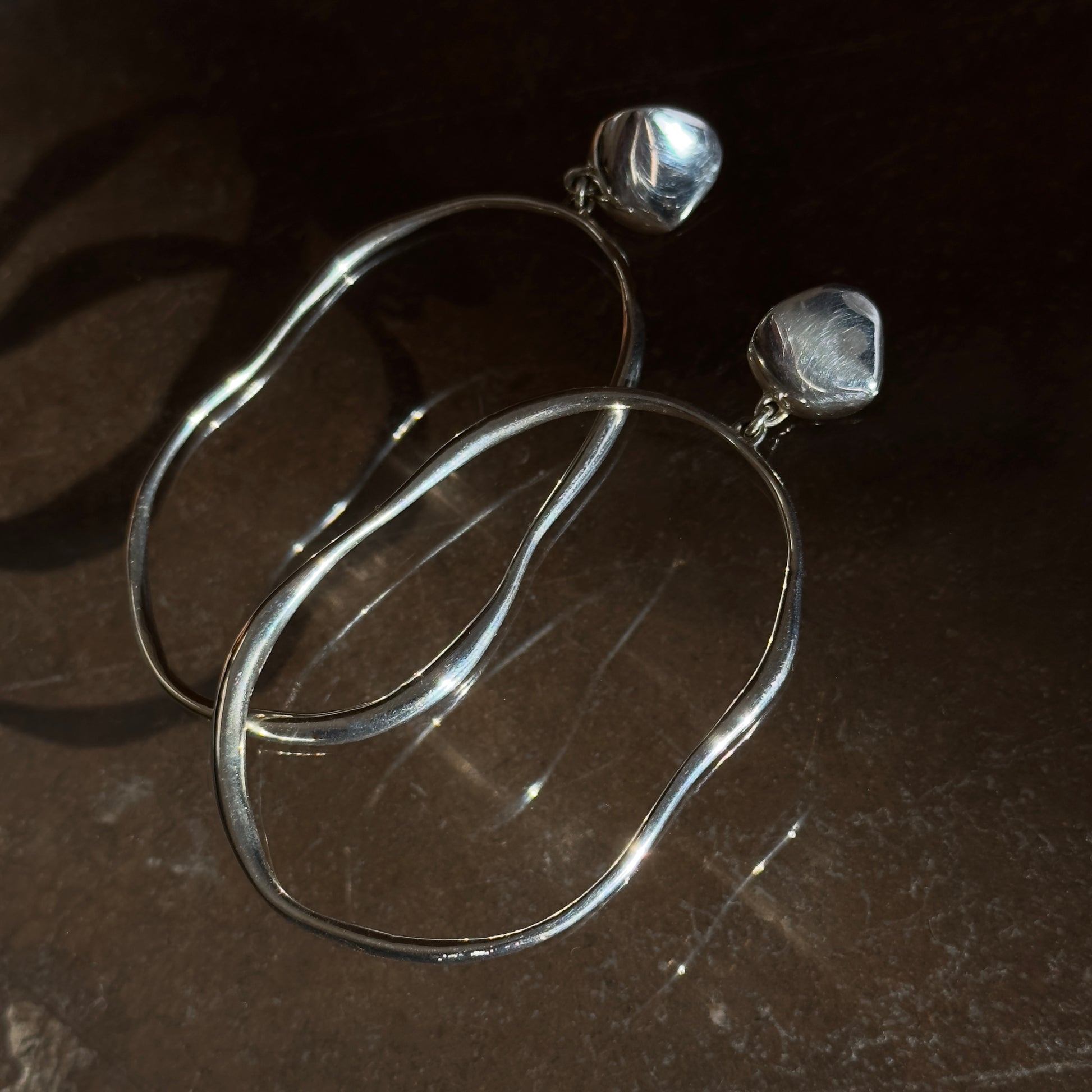 The Faris Vero Drop Earrings in Sterling Silver are sculptural statement pieces designed by Faris Du Graf. These earrings feature a curved top that rests beneath the earlobe, connected to an undulating, organically-shaped hoop, offering a modern take on a retro silhouette.