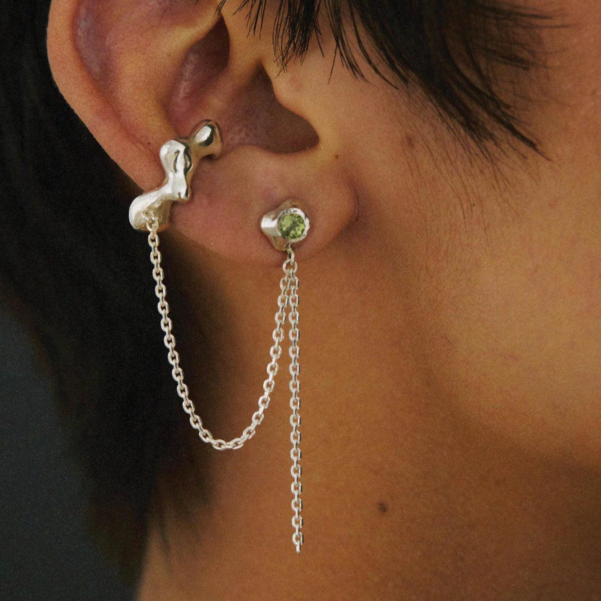 The Zelda Stud Cuff by Faris is a sculptural ear cuff, expertly crafted in sterling silver and featuring a vibrant peridot gemstone. Designed to be worn on the helix or lobe, this bold piece combines modern elegance with timeless design.