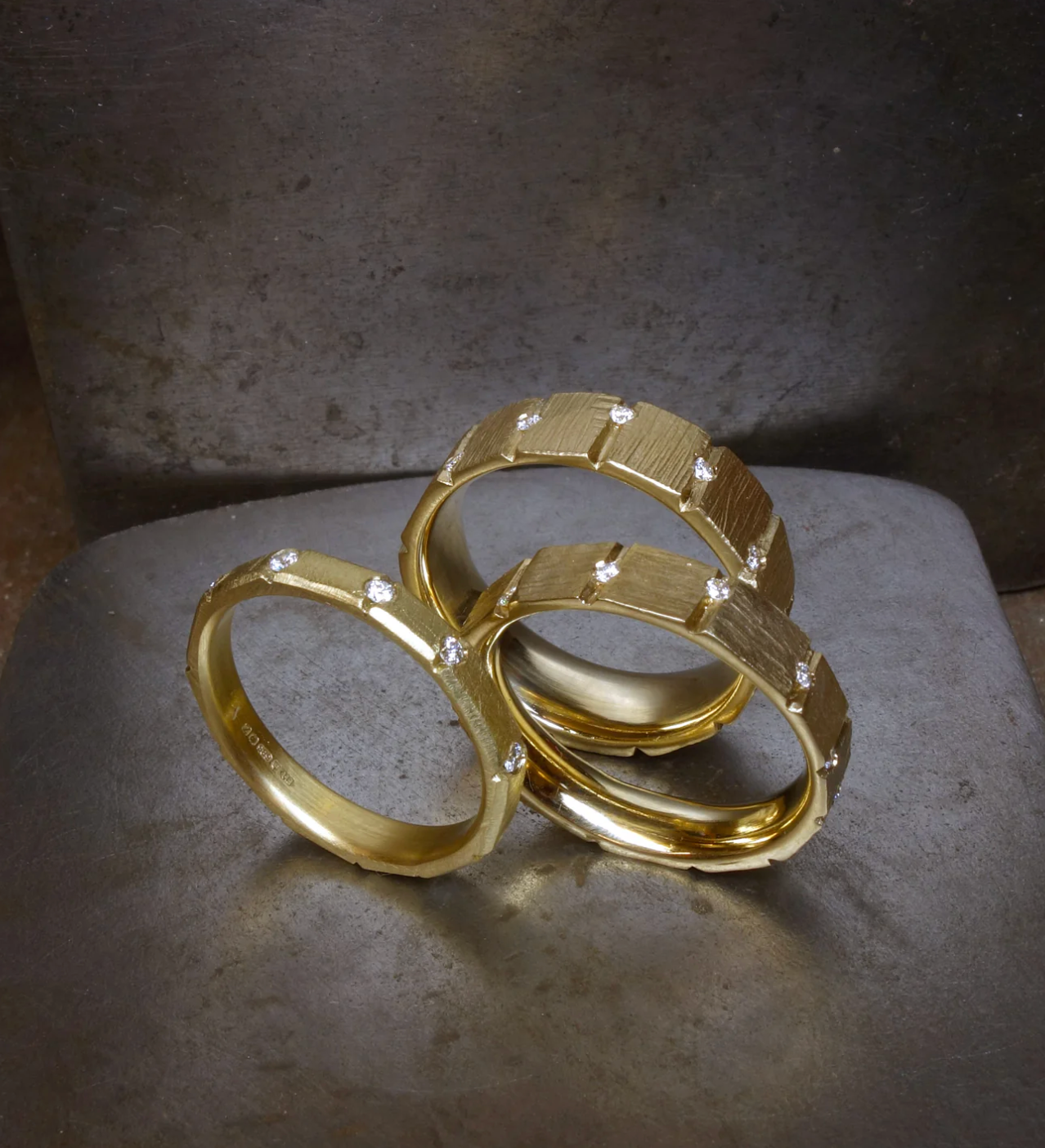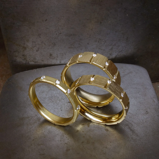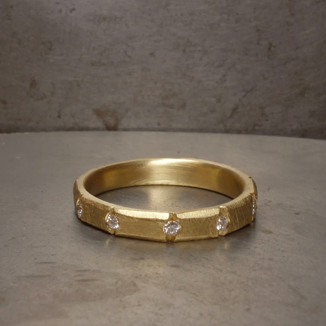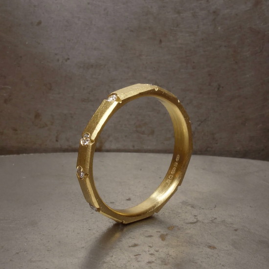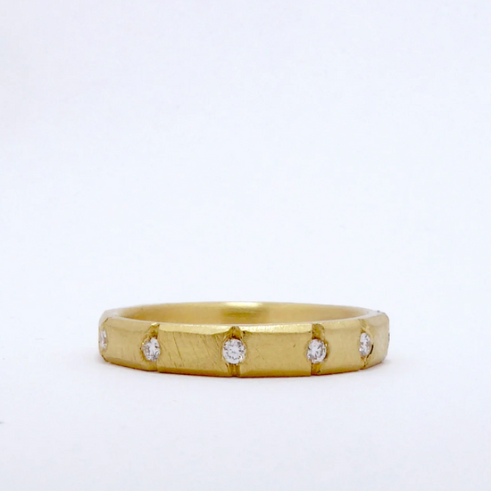 A hand carved solid gold band with faceted and rough hewn, solid and sculptural brick like detail - between each unique section. a diamond is firmly set.