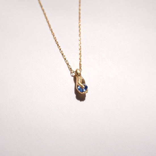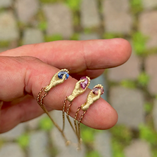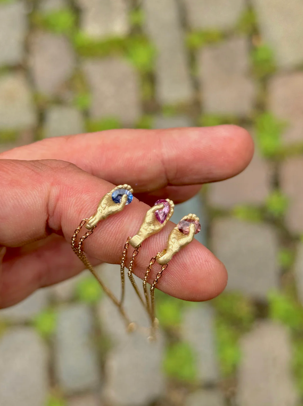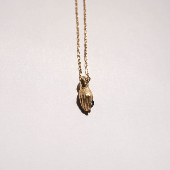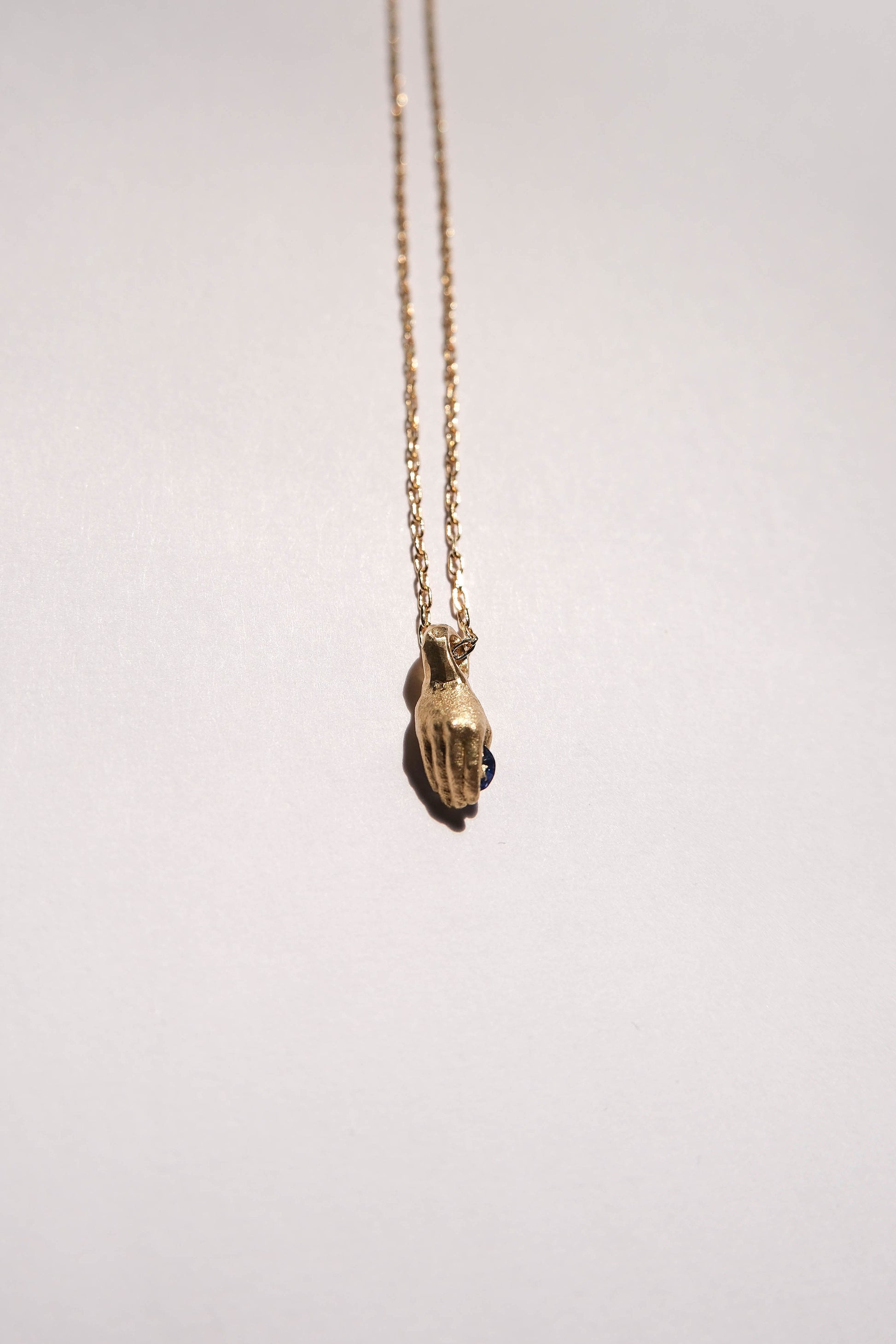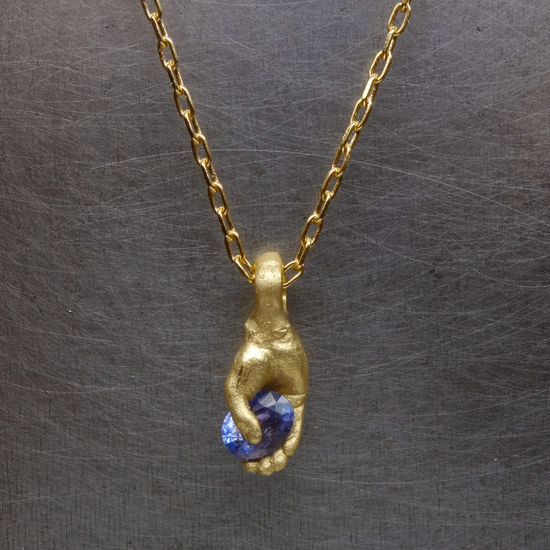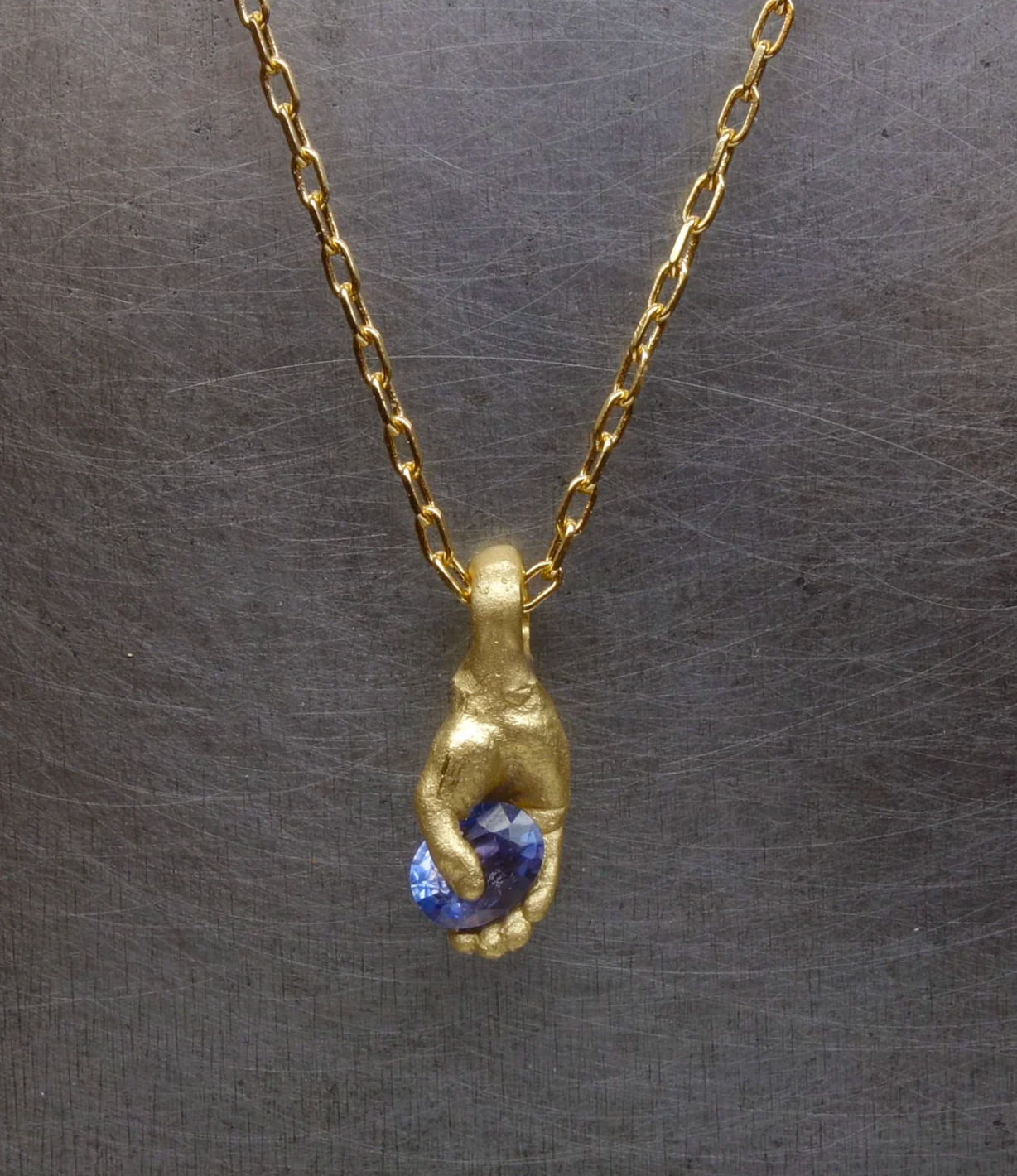 Handmade by Fraser Hamilton, the Hand Pendant, a finely-detailed hand clasps an exquisite natural sapphire and presents it to the beholder. Each pendant is unique with subtle differences in the angle shape and color of the gemstone.