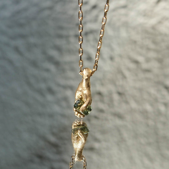 Handmade by Fraser Hamilton, the Hand Pendant, a finely-detailed hand clasps an exquisite natural sapphire and presents it to the beholder. Each pendant is unique with subtle differences in the angle shape and color of the gemstone.
