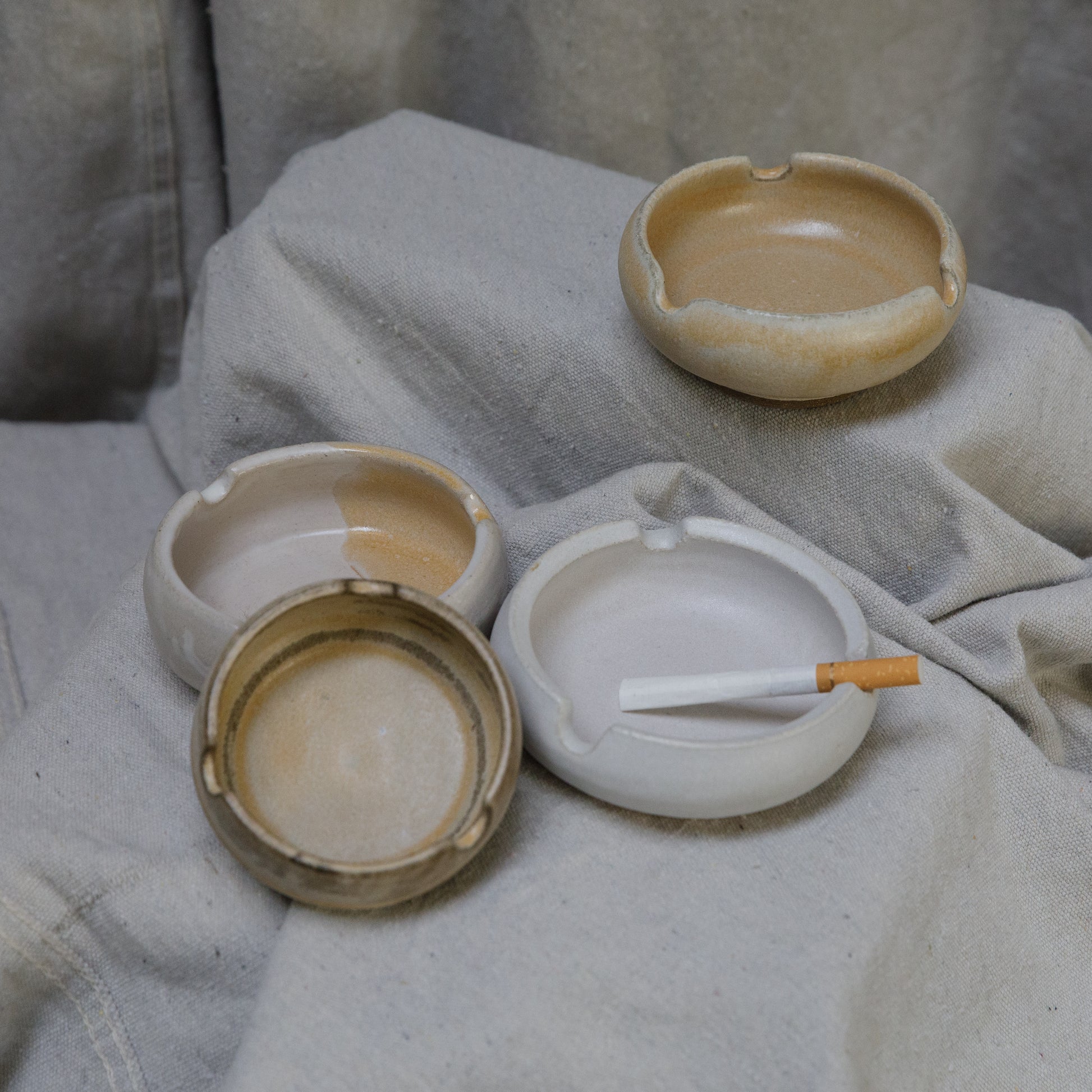 Hand-built ceramic ashtrays in assorted glazes and organic shapes. Each piece is one-of-a-kind, with carved grooves and soft edges—functional for smoking, burning incense, or holding small objects.