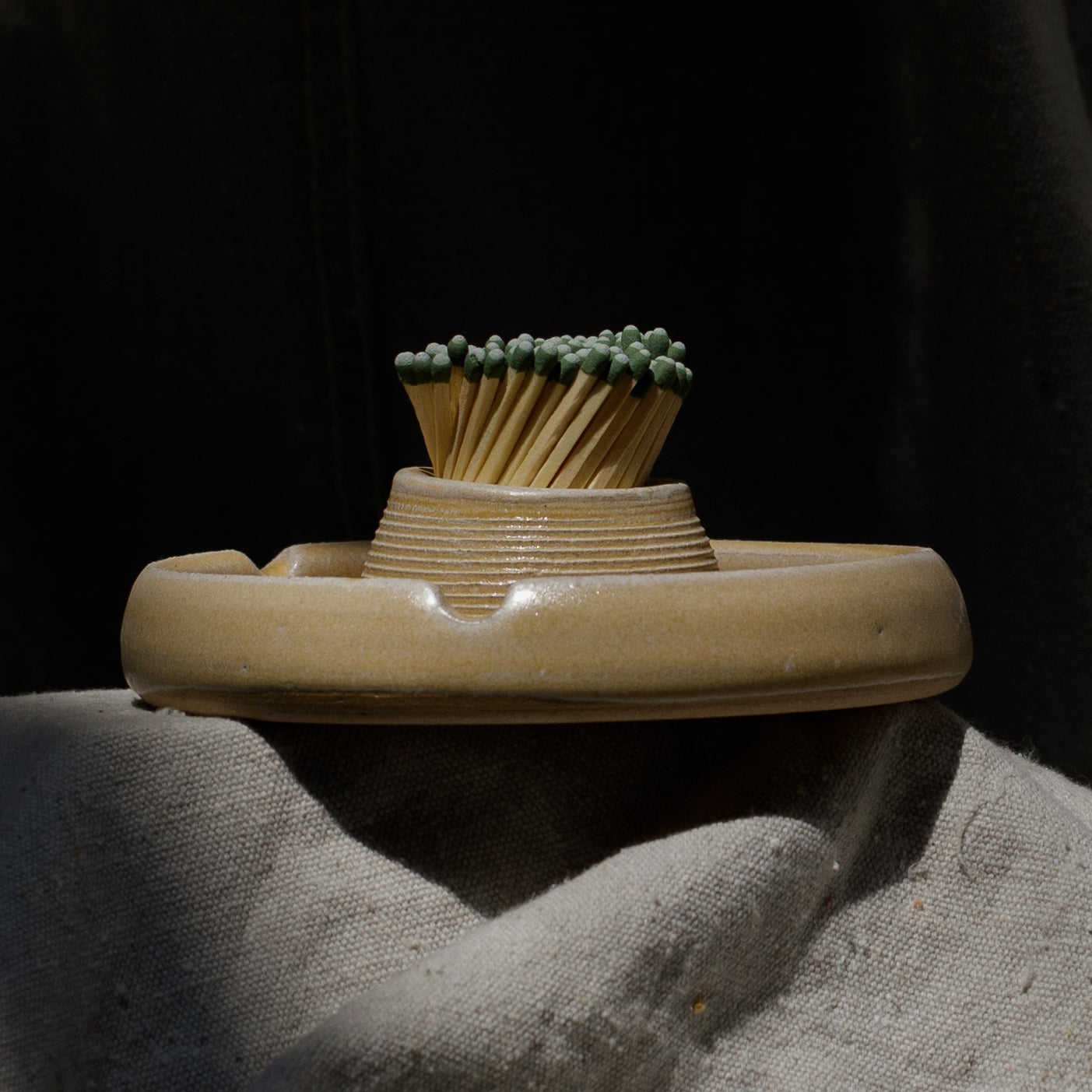 A multi-use ceramic piece designed to hold ash, strike matches, or simply sit sculpturally. Each one is hand-built with a grooved strike surface and glazed finish—no two exactly alike.