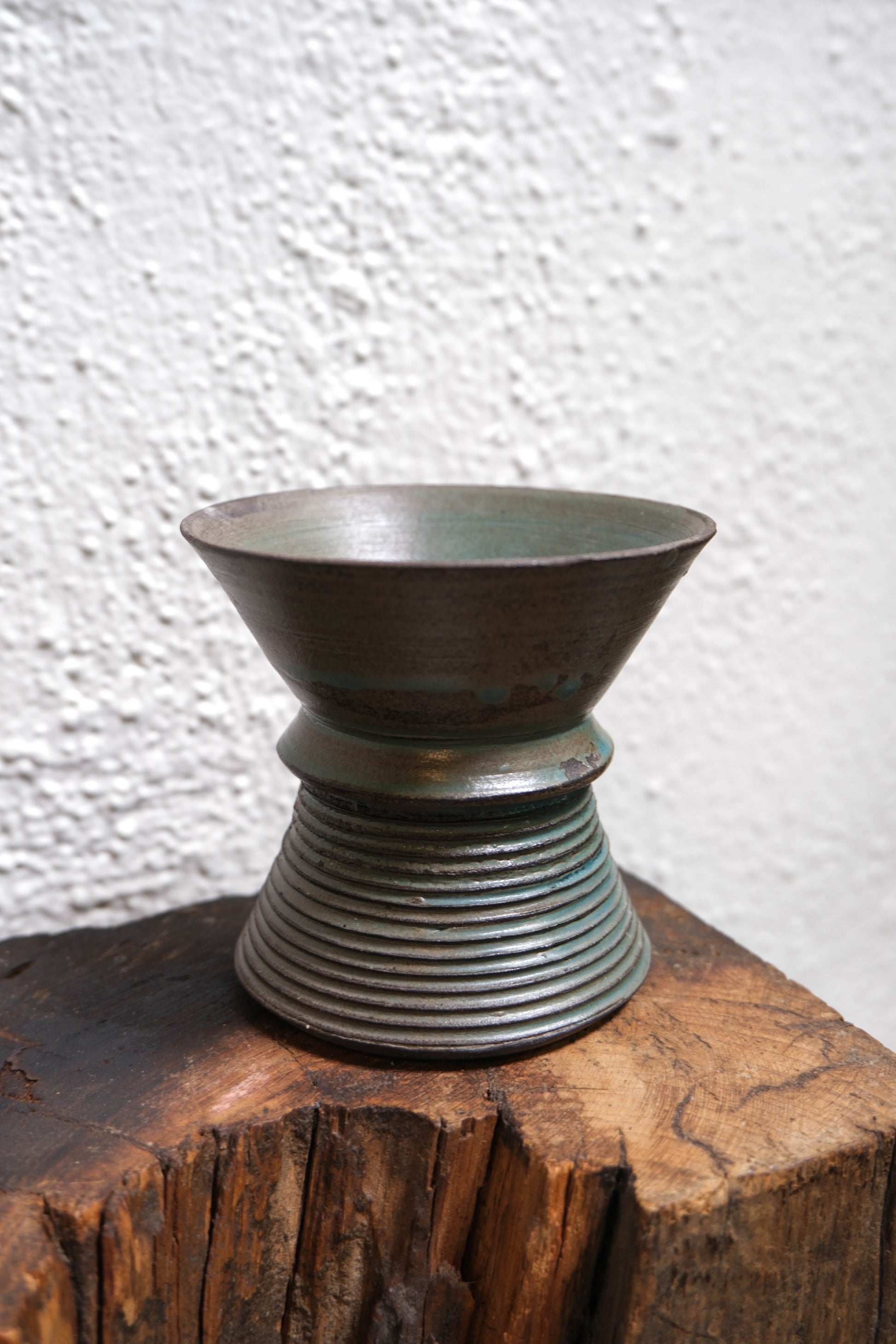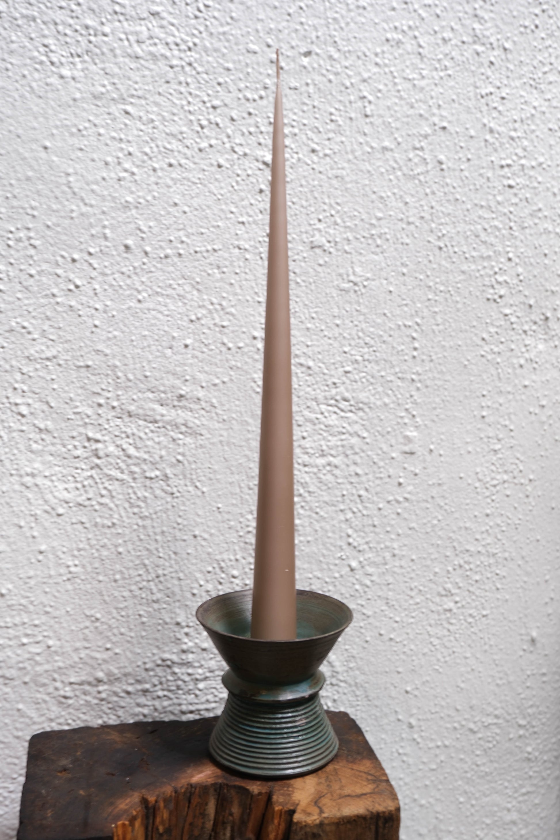 A hand-built ceramic candlestick in glossy turquoise glaze. Slightly flared at the base with soft, sculptural lines. Meant to be mixed, matched, or admired solo.