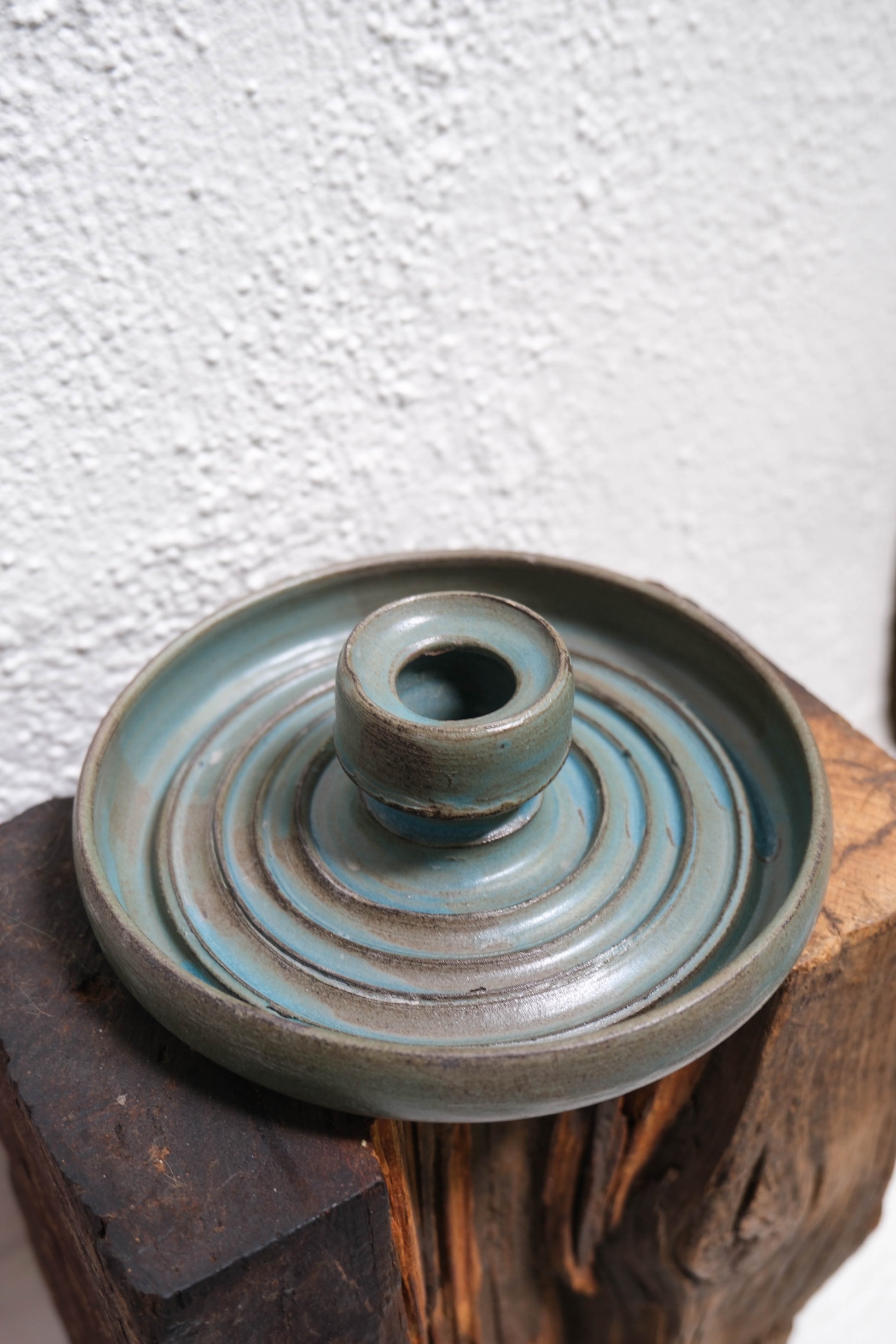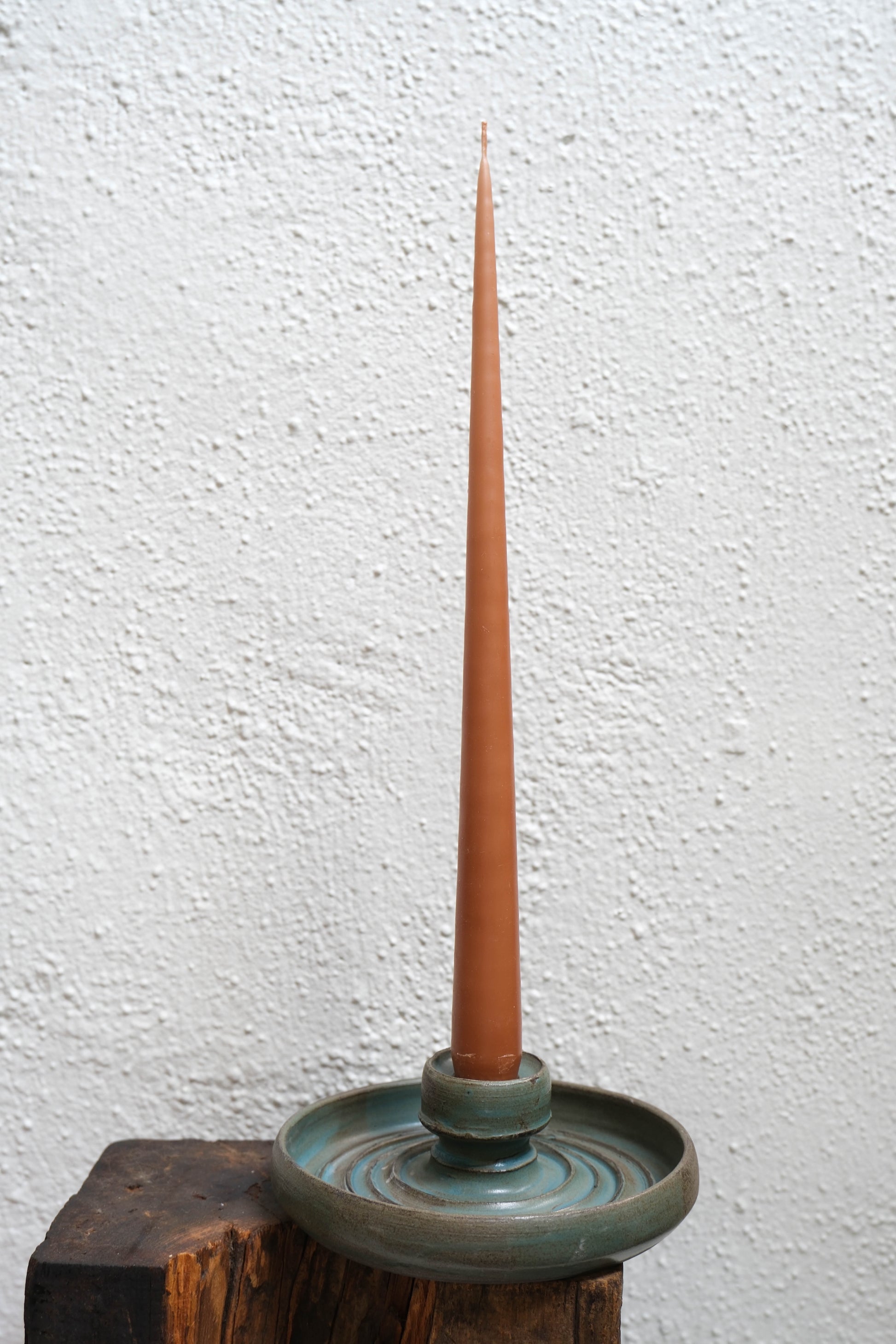 A hand-built ceramic candlestick in glossy turquoise glaze. Slightly flared at the base with soft, sculptural lines. Meant to be mixed, matched, or admired solo.