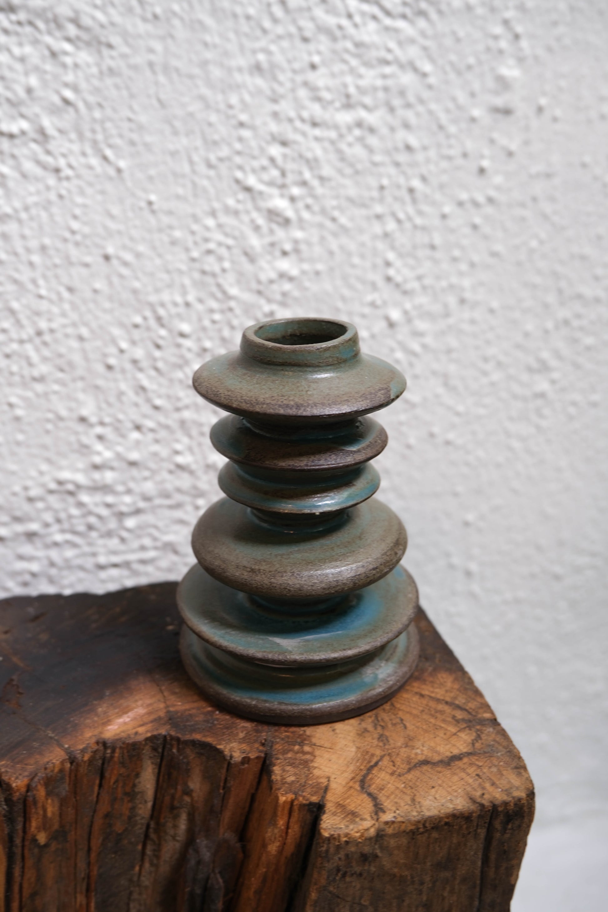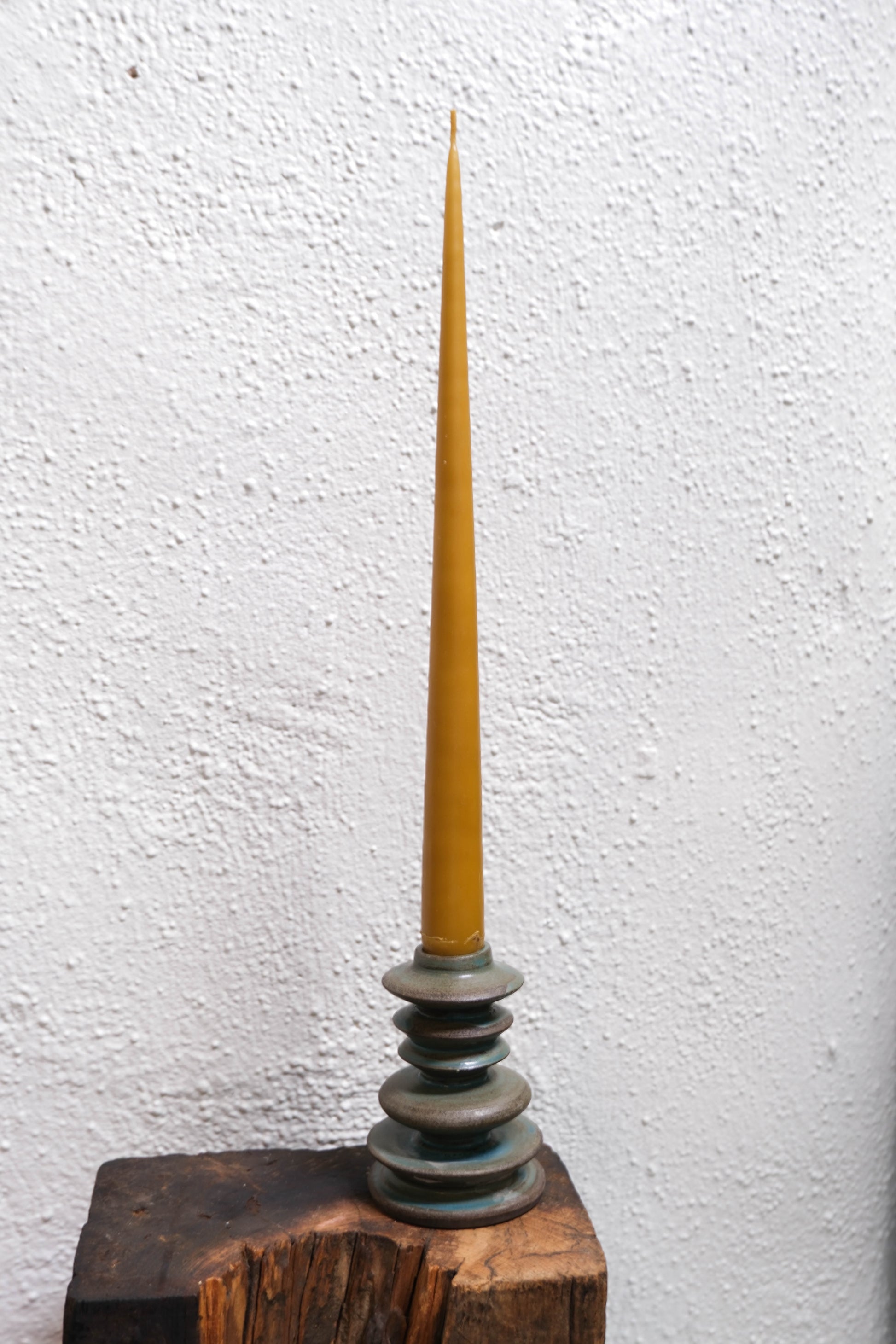 A hand-built ceramic candlestick in glossy turquoise glaze. Slightly flared at the base with soft, sculptural lines. Meant to be mixed, matched, or admired solo.