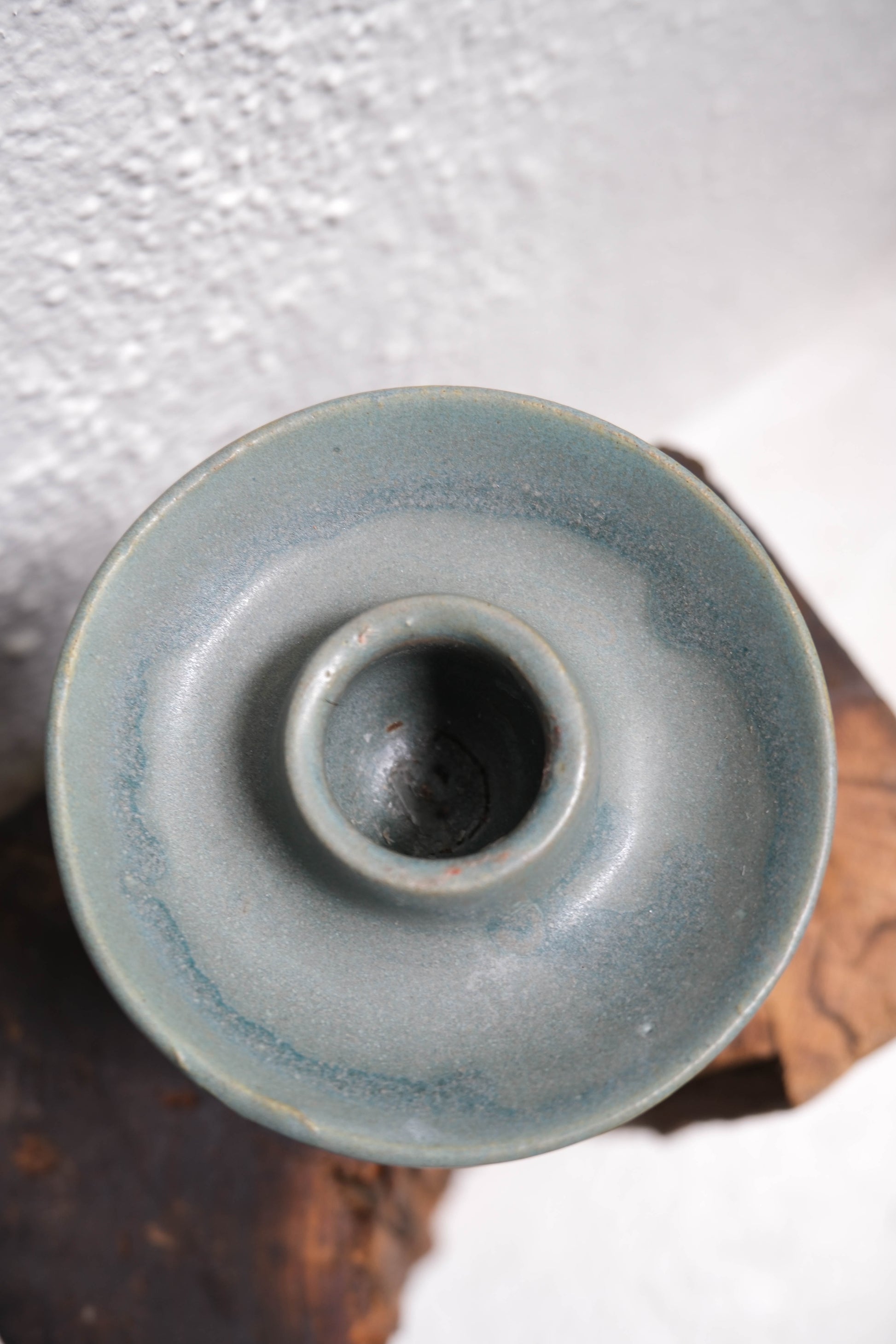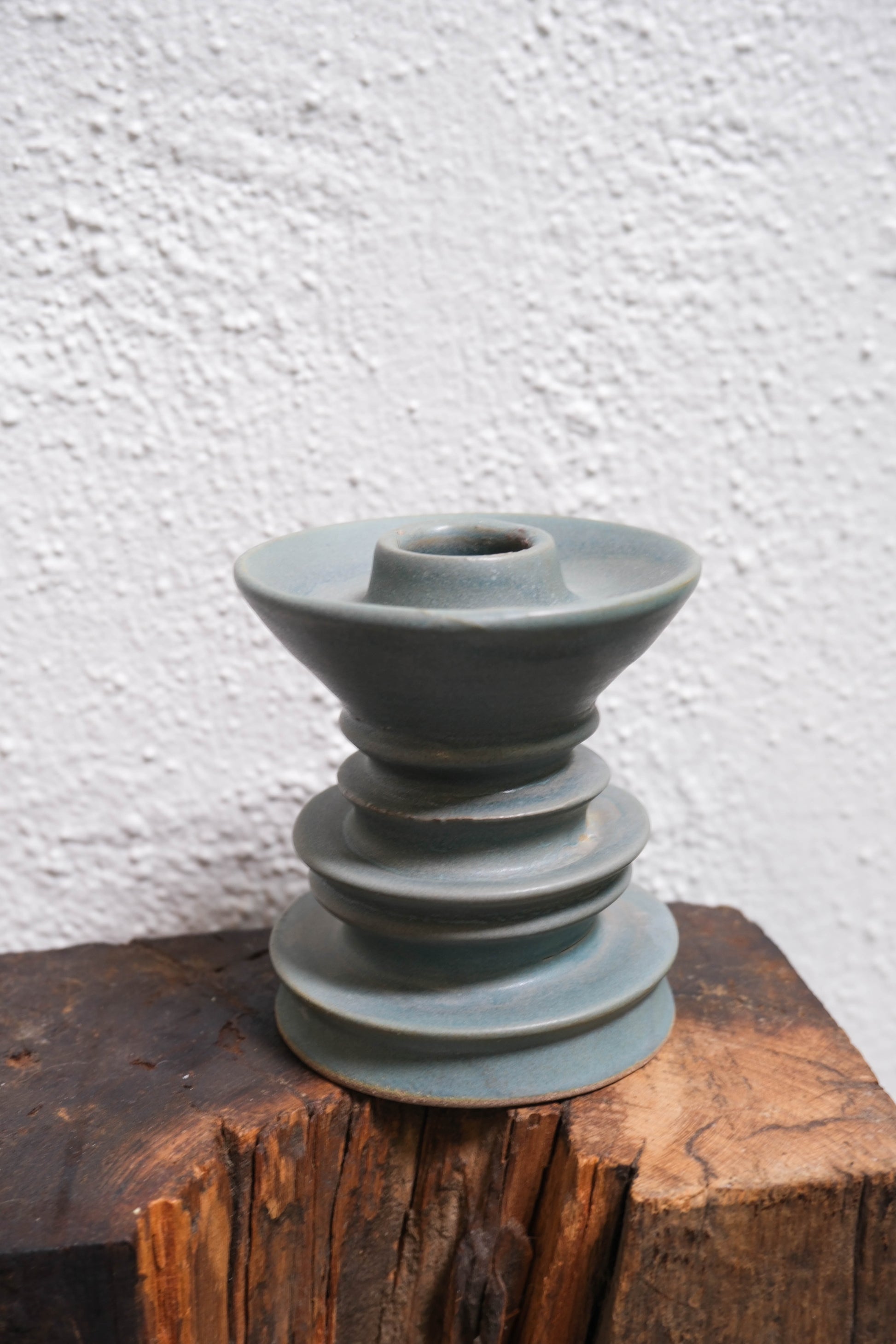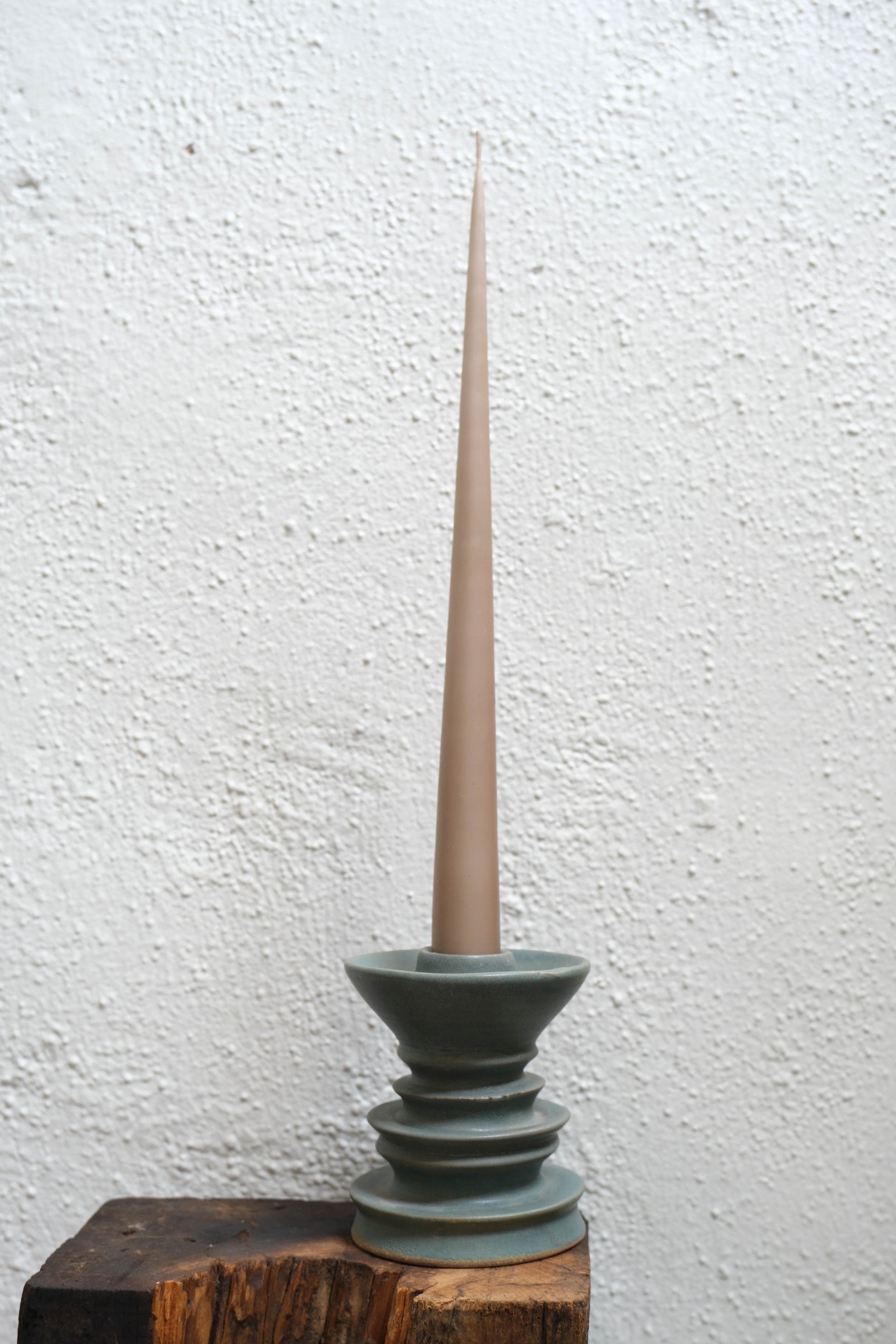 A hand-built ceramic candlestick in glossy turquoise glaze. Slightly flared at the base with soft, sculptural lines. Meant to be mixed, matched, or admired solo.