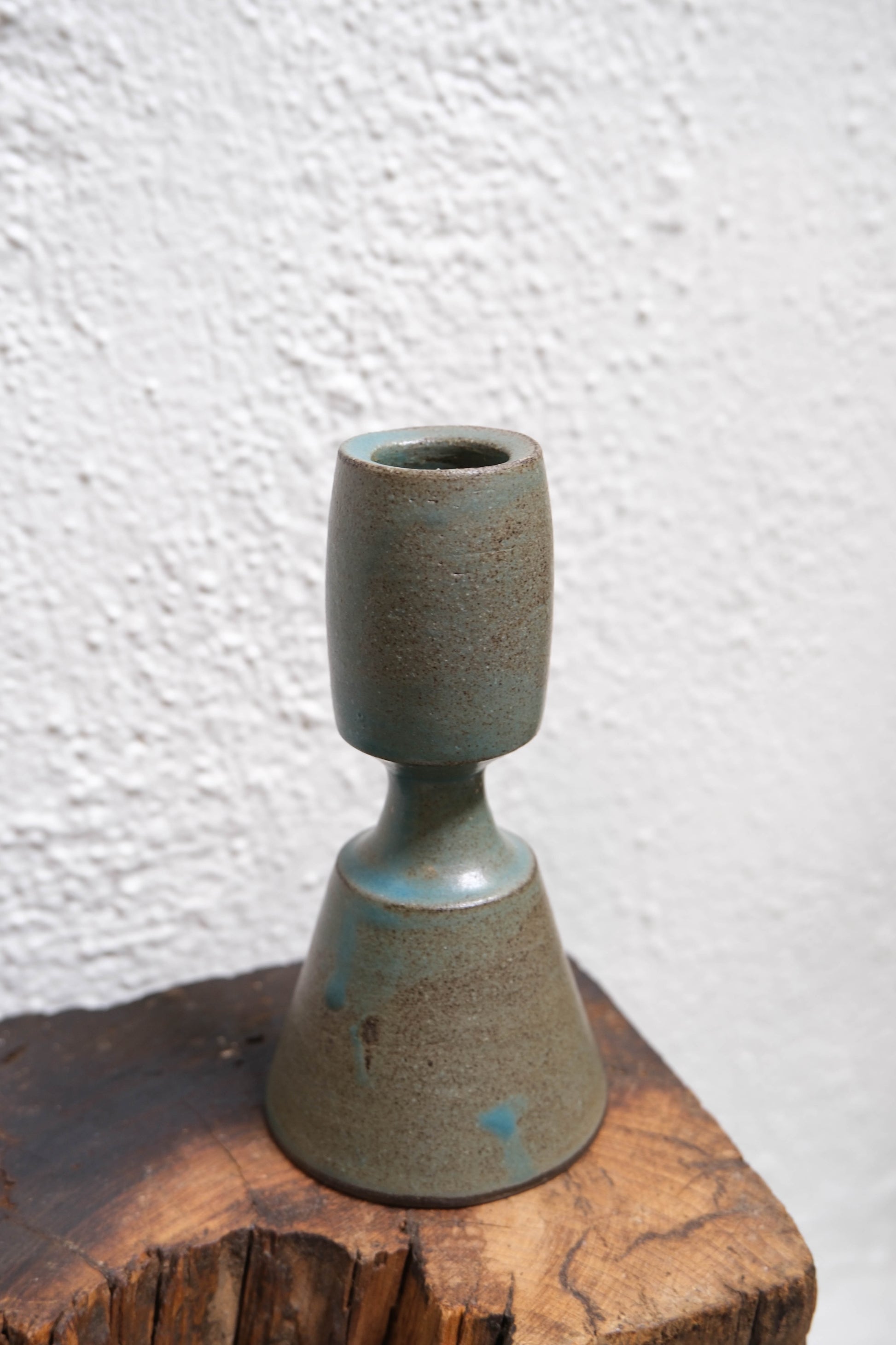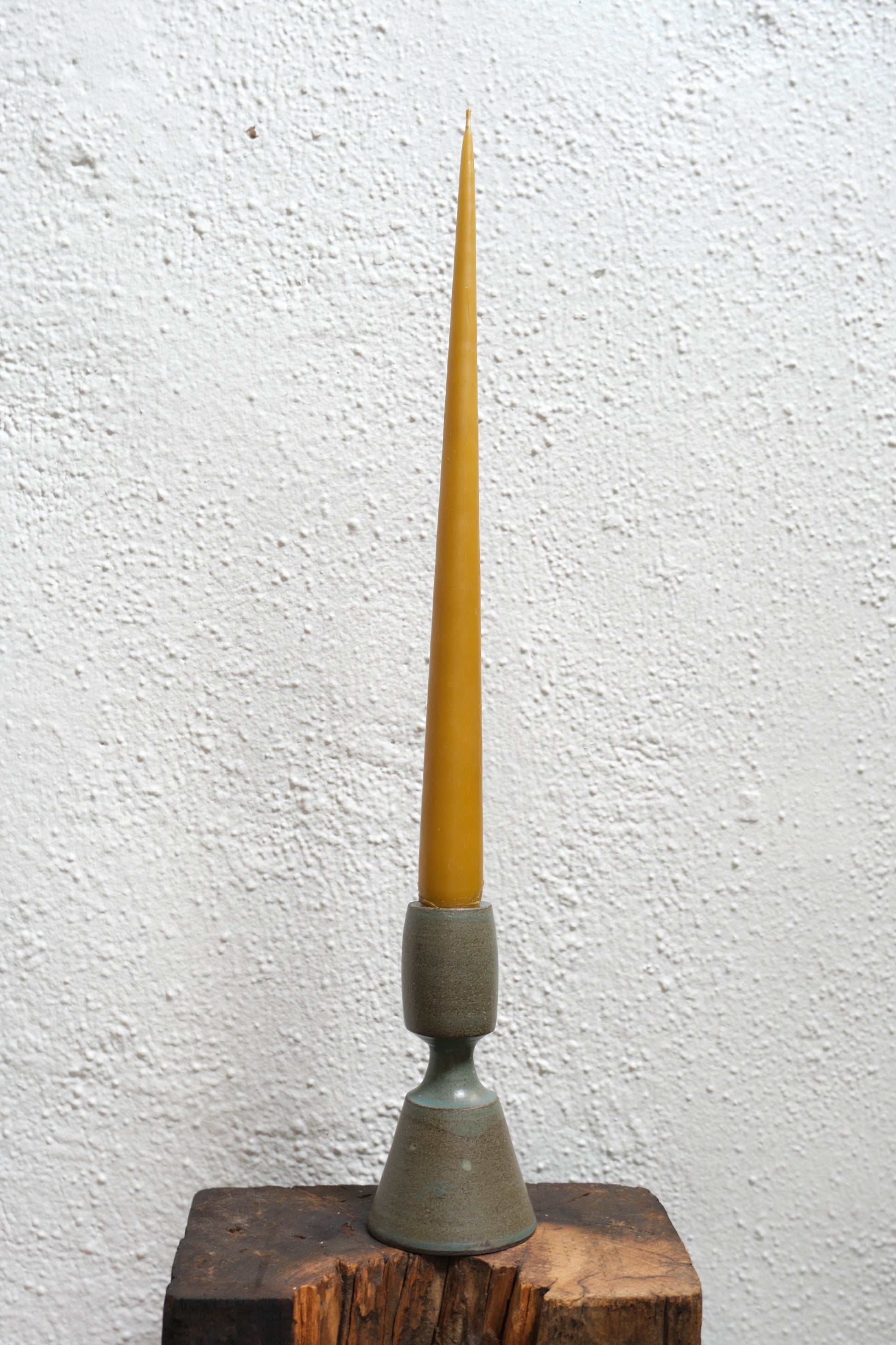 A hand-built ceramic candlestick in glossy turquoise glaze. Slightly flared at the base with soft, sculptural lines. Meant to be mixed, matched, or admired solo.