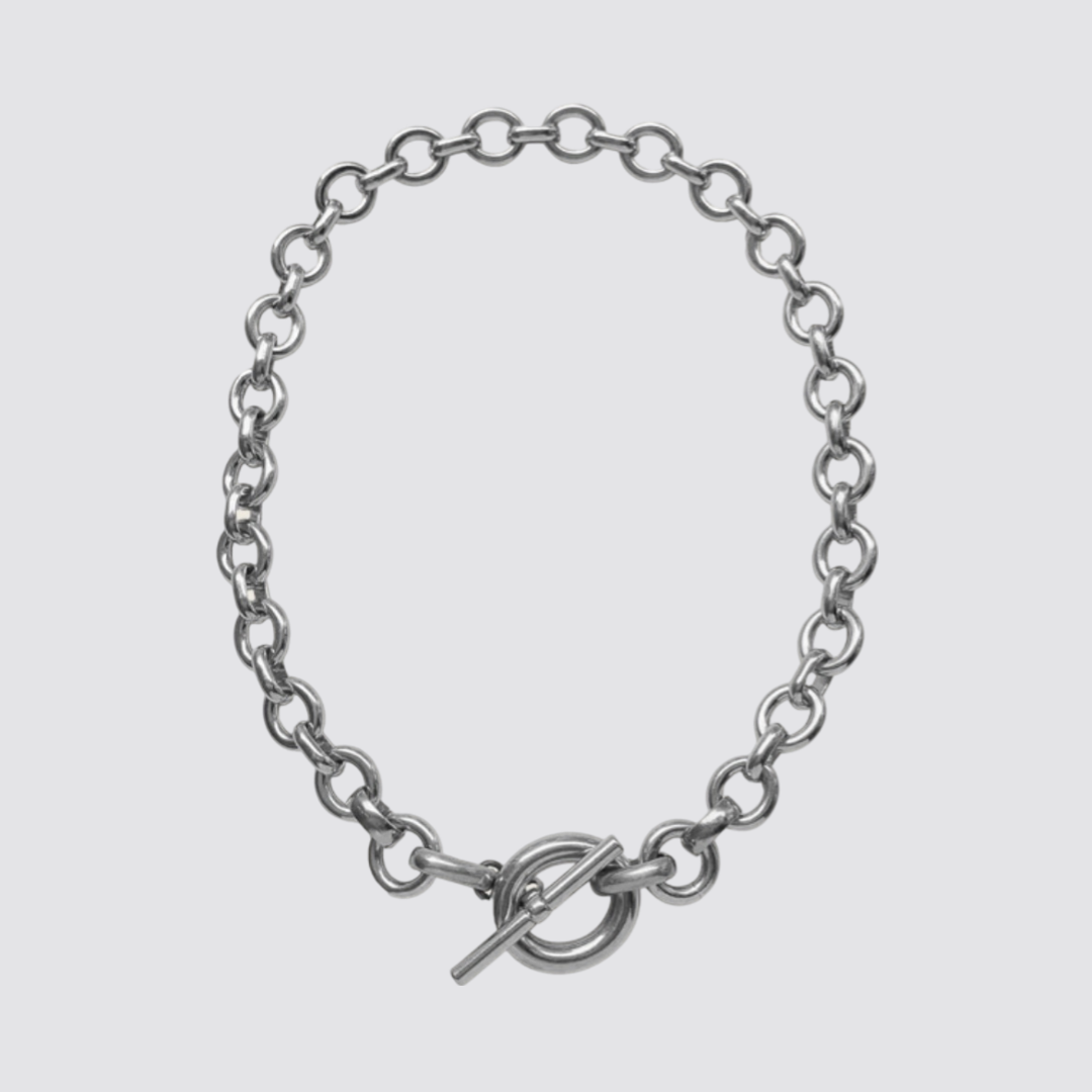 The Laura Lombardi Portrait Necklace is a bold, handcrafted piece that blends minimalist design with a touch of nostalgia. Featuring oversized interlocking chain links and a distinctive T-bar clasp, this necklace is available in both gold-tone and silver-tone finishes, allowing for versatile styling options.