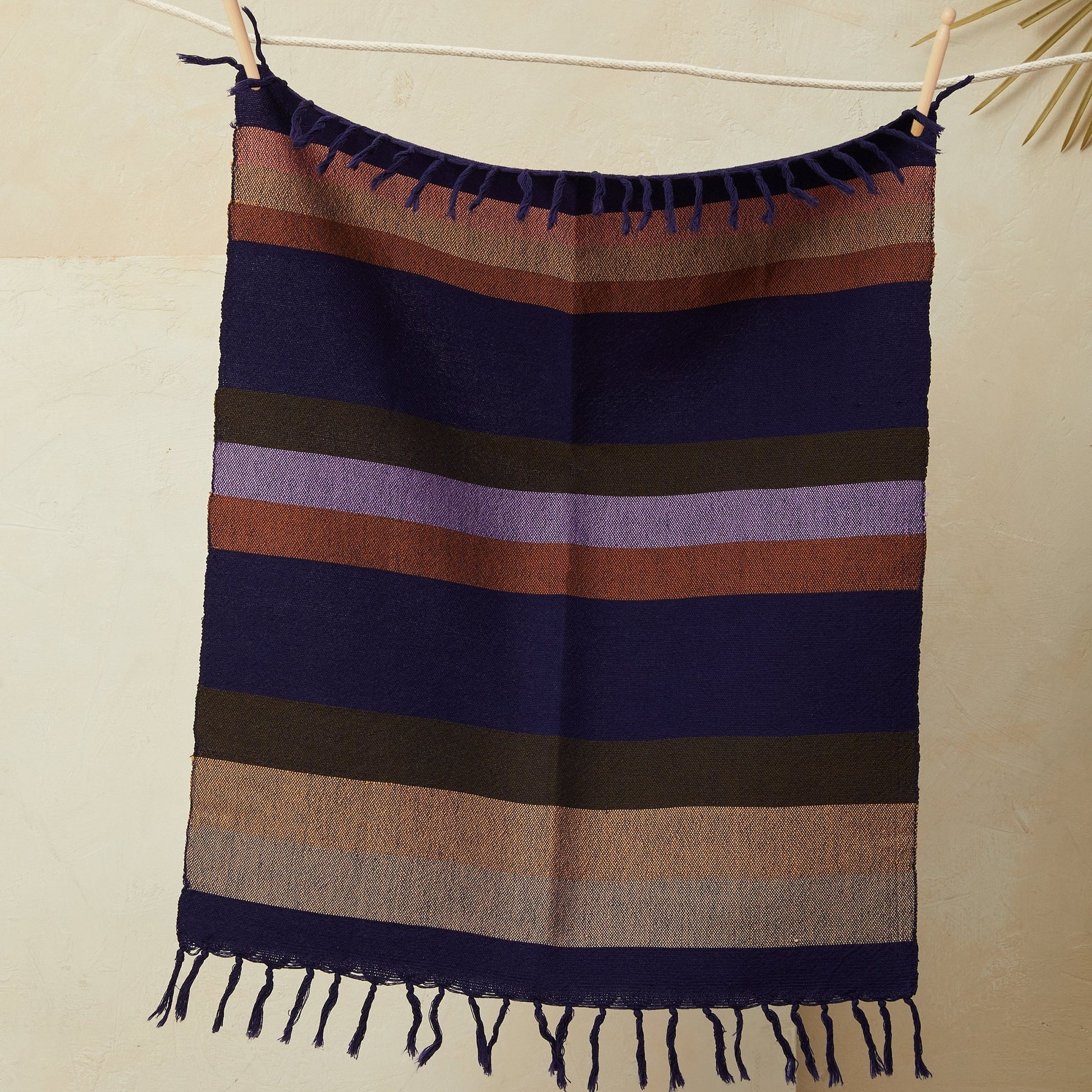 The MINNA Fruit Stripe Hand Towel in Plum is a handwoven, 100% cotton towel crafted by artisans in Nahualá, Guatemala. Measuring 20" x 26", it features a vibrant palette of plum, navy, rust, and lilac stripes, adding a pop of color to any kitchen or bathroom. Lightweight and fast-drying, this towel becomes softer with each wash.