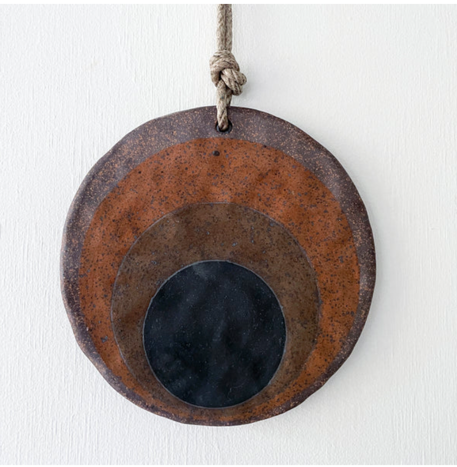 Large round ornament in Tucker stoneware is hand painted with Nested Three- Black, Medium Brown & Golden Brown