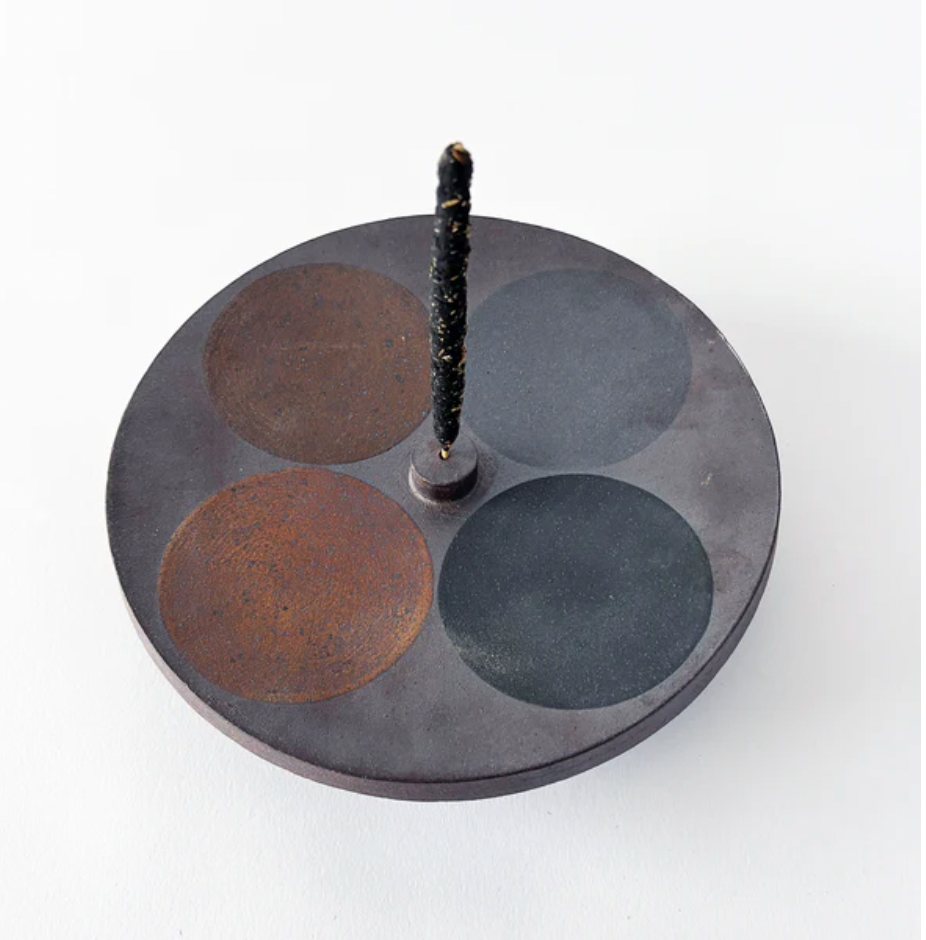 Hand built extra dark Tucker stoneware reliquary incense burner is painted with Four Black (Black, Dark Brown, Med Brown and Golden Brown) Circles