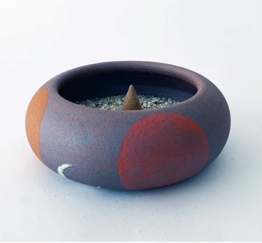 Rock Vessel in extra dark Tucker stoneware is painted with Four Rainbow- Indigo, Red, Orange, Marigold & a signature glazed Crescent Moon