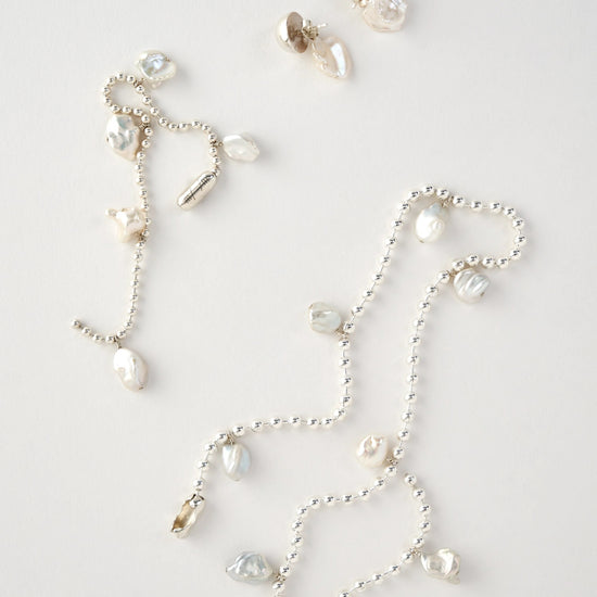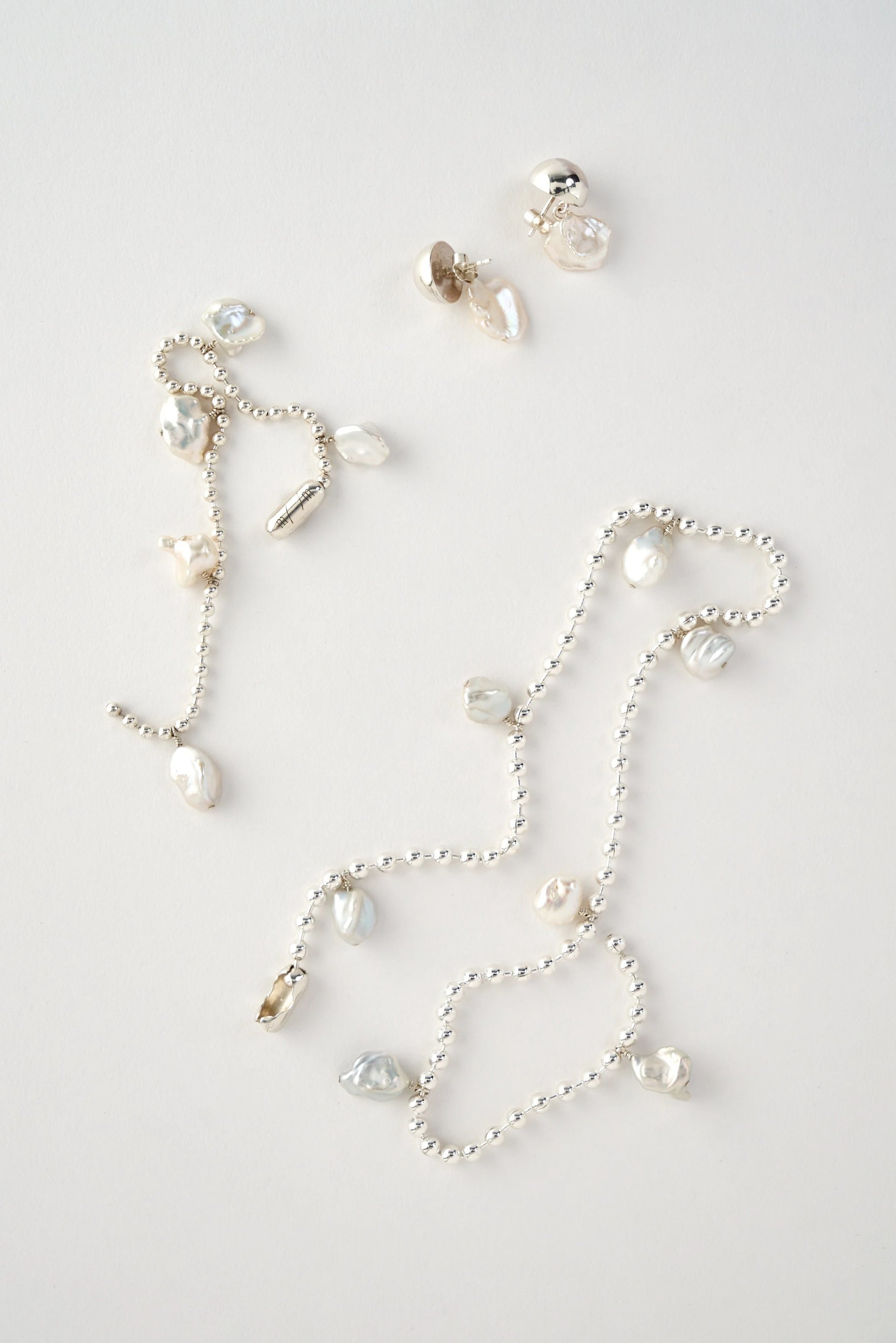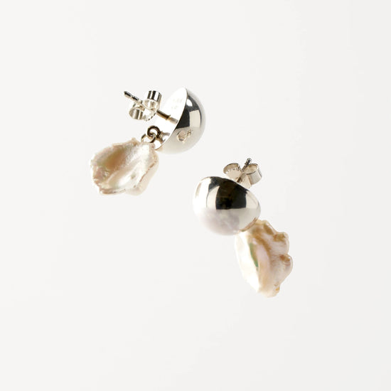 Attached to a silver hemisphere, a naturally shaped freshwater pearl gently swings according to the wearer's movements and adds a discrete sparkle. Each one is unique.