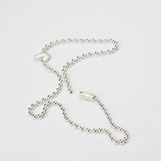 The roughness of this military chain is broken up by a naturally shaped freshwater pearl. It has a classic ball-chain closure.
