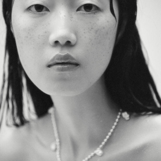 The roughness of military chain is combined with seven naturally shaped freshwater pearls that sit like salty waterdrops around your neckline. This version of the Keshi Necklace keeps the contrasting material and shape of the original design but adds a juvenile freshness through the subtle movements of the shiny pearls.