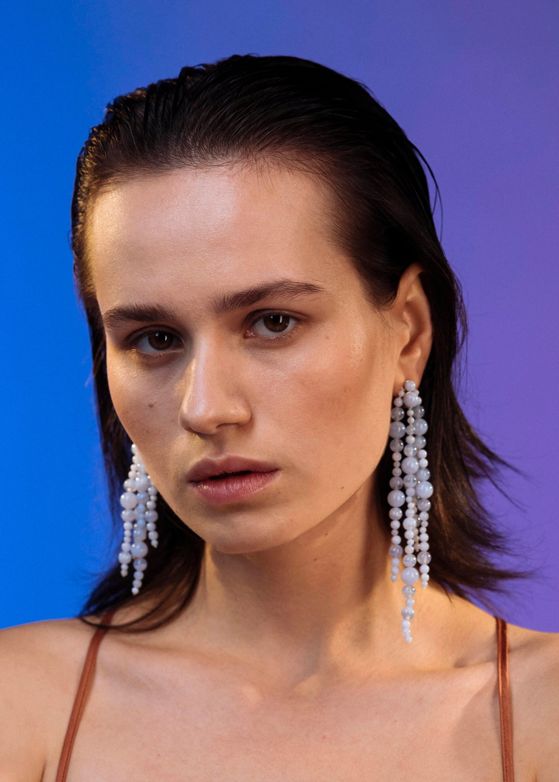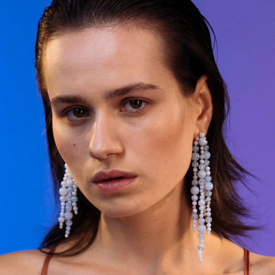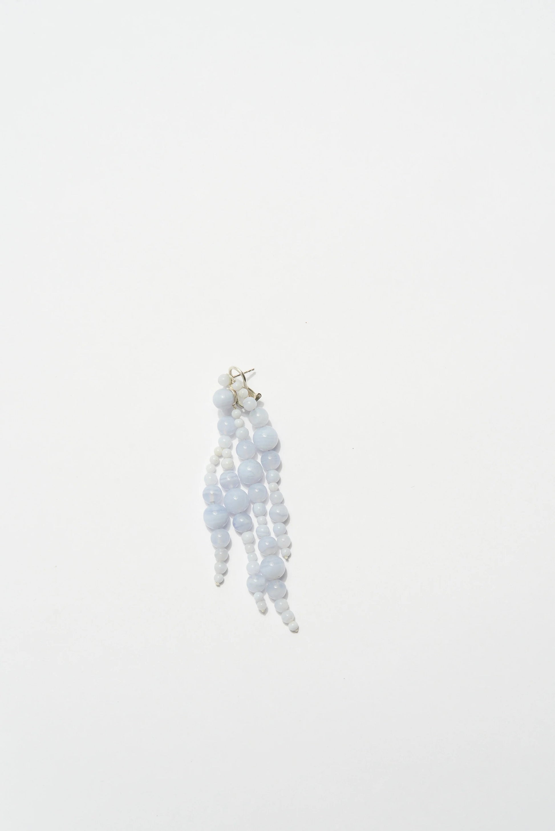 These earrings combine different sizes of geometric spheres, resulting in a playful and organic piece. Through the motions of the wearer, the stones move like underwater plants, flattering the wearer's facial features. Made of light blue chalcedon. The pin and fastener are made of sterling silver.