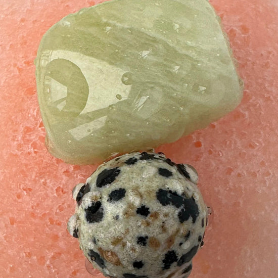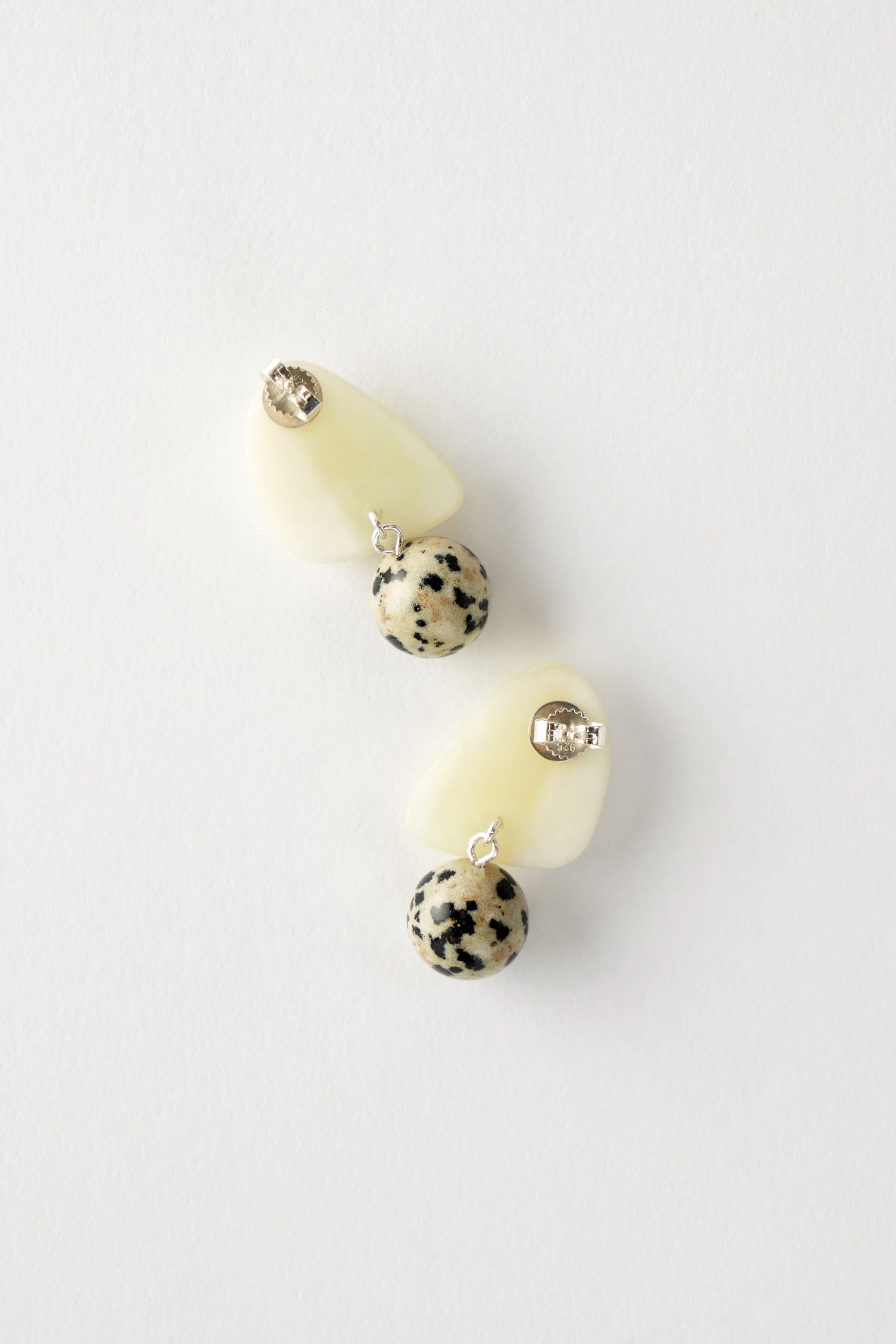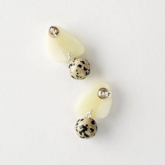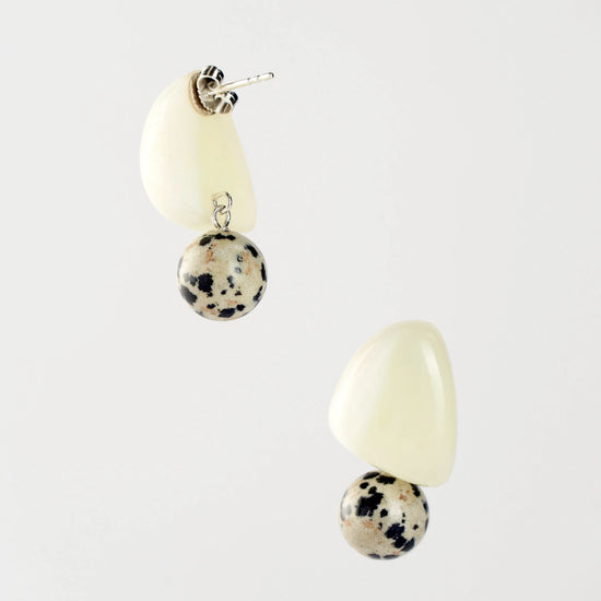 Attached to a jade pebble, a delicate dalmatian jasper sphere gently sways in rhythm with the wearer's movements. The contrast between the cool, smooth jade and the playful spots of the dalmatian stone creates a harmonious and balanced piece. Ready to add a sheer touch of color to both casual and special outfits.