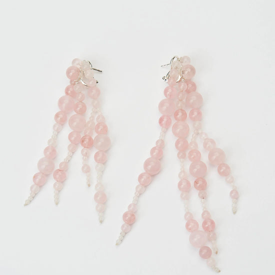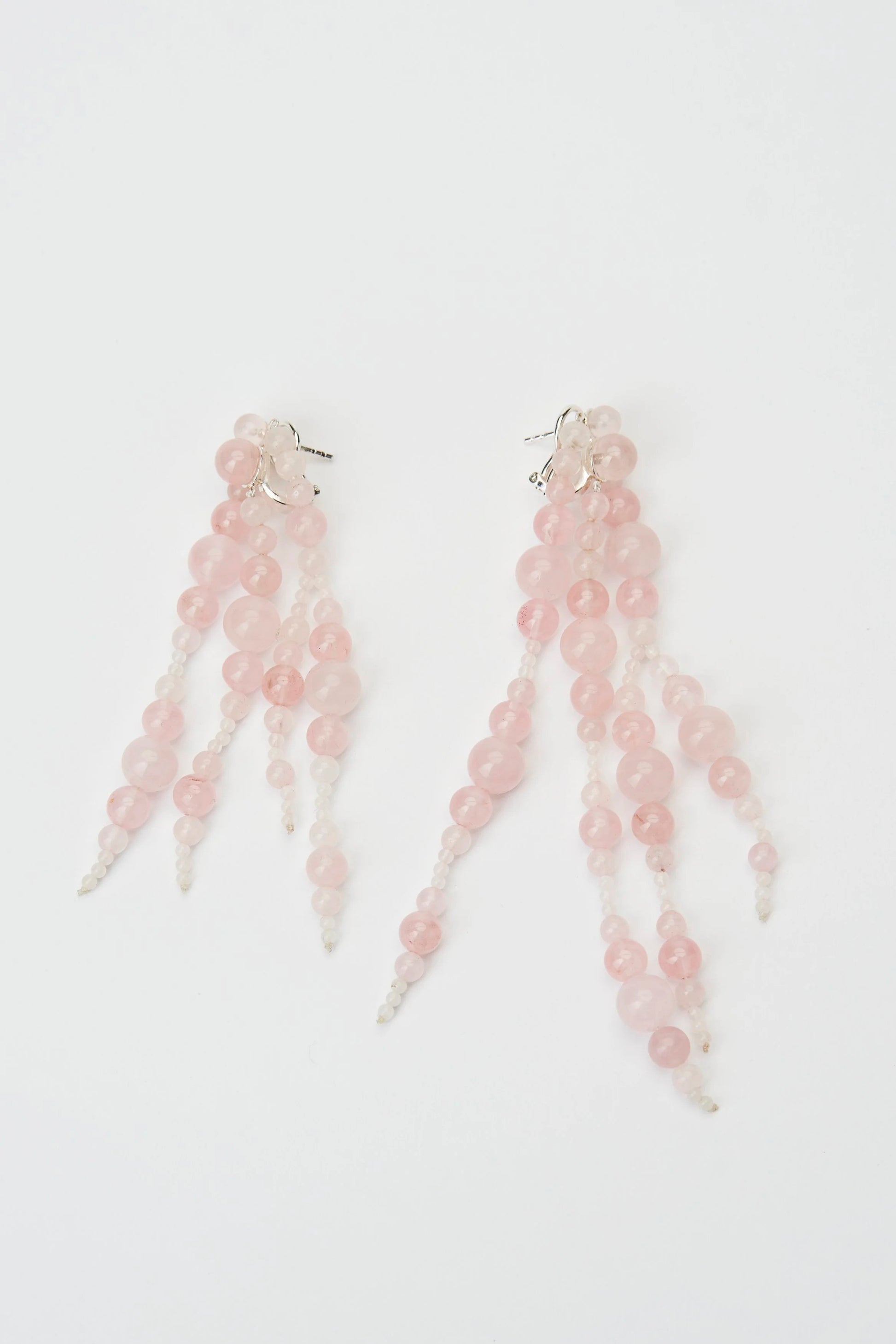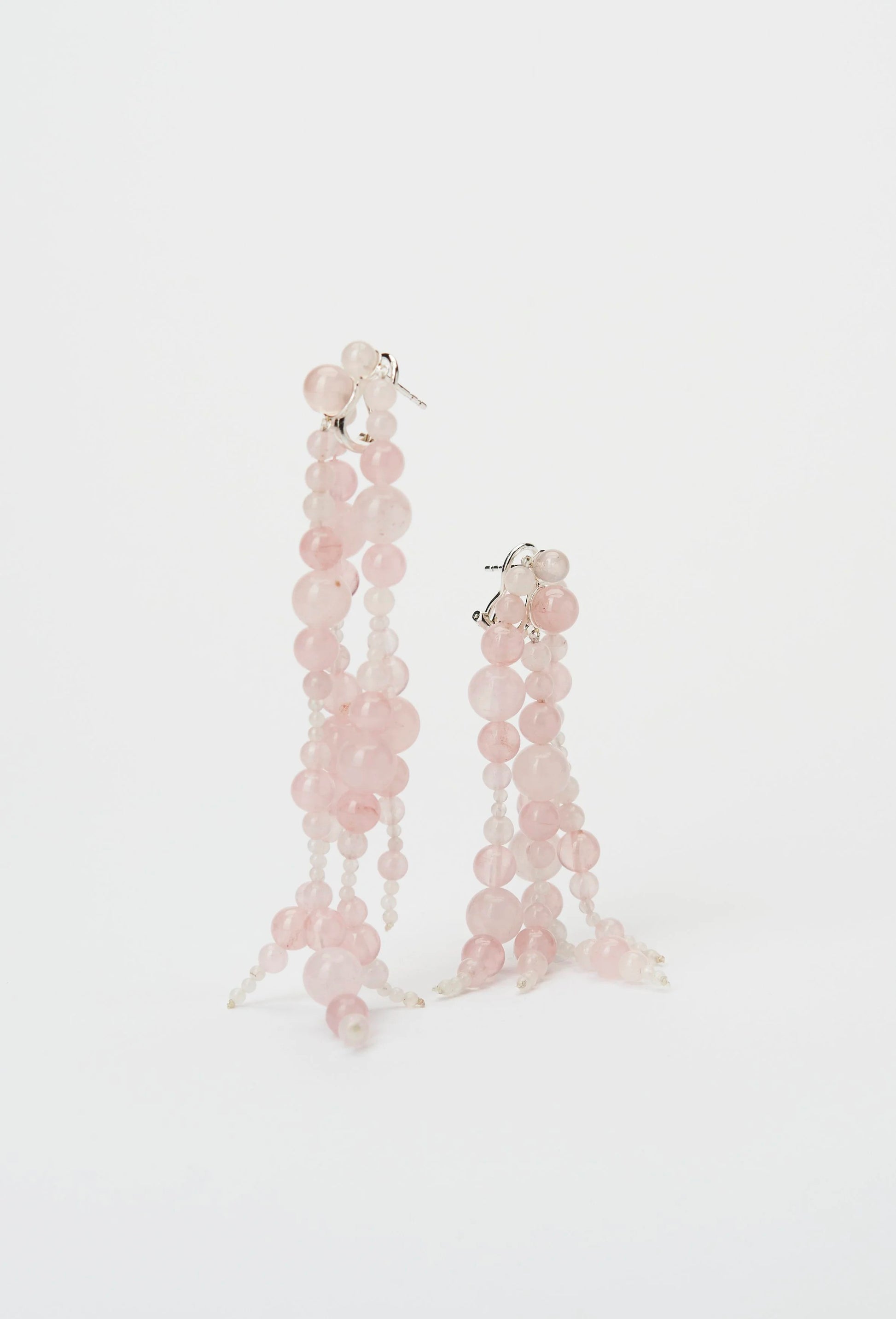 These earrings combine different sizes of geometric spheres, resulting in a playful and organic piece. Through the motions of the wearer, the stones move like underwater plants, flattering the wearer's facial features. Made of rose quartz. The pin and fastener are made of sterling silver.