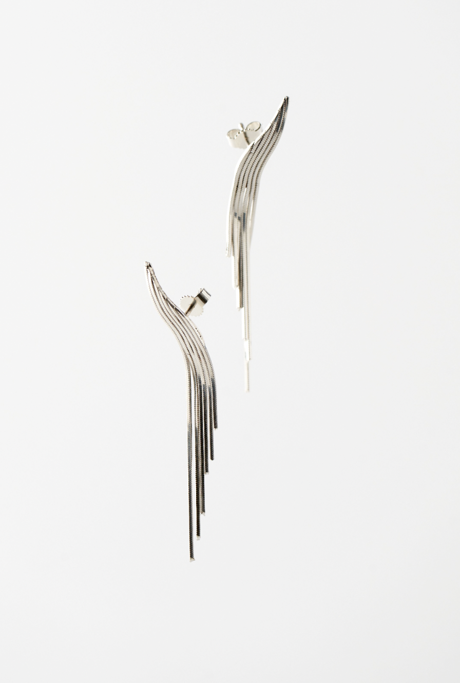 These sterling silver earrings trickle down from your earlobe to your neckline, resembling a cascade. They dance nimbly with the light to frame the wearer's facial features. Powerfully yet delicately creating a presence.