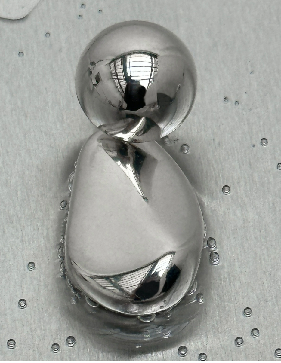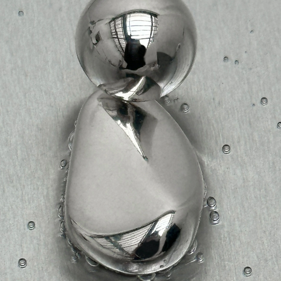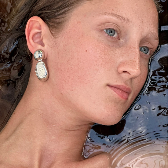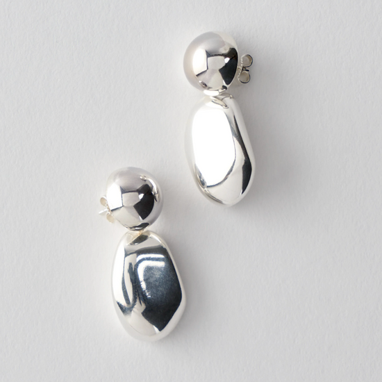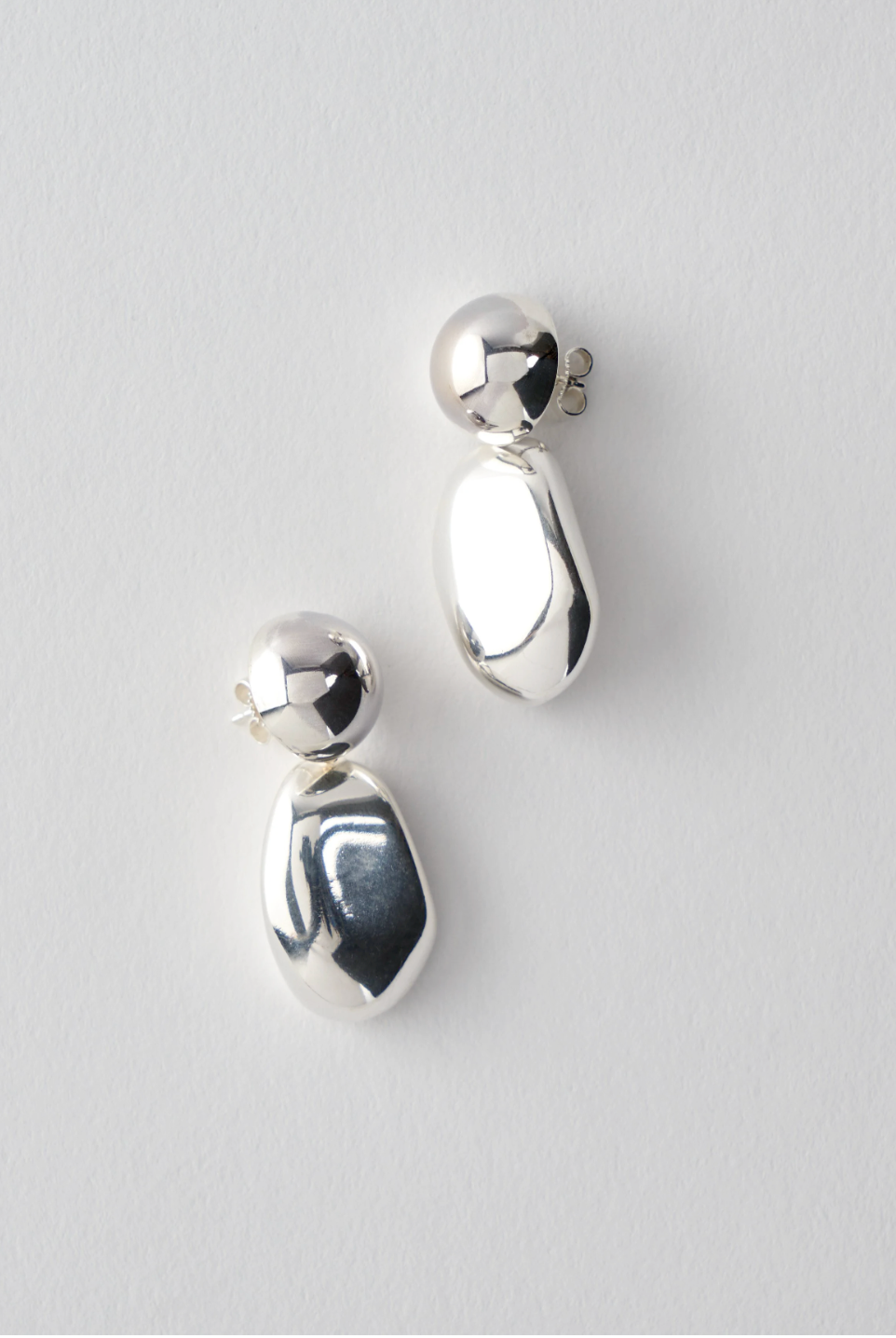 Attached to a silver hemisphere, a silver pebble that gently swings according to the wearer's movements and changes its appearance depending on how the light hits it. The contrast between geometrical and organic shapes enhances the wearer's facial features.