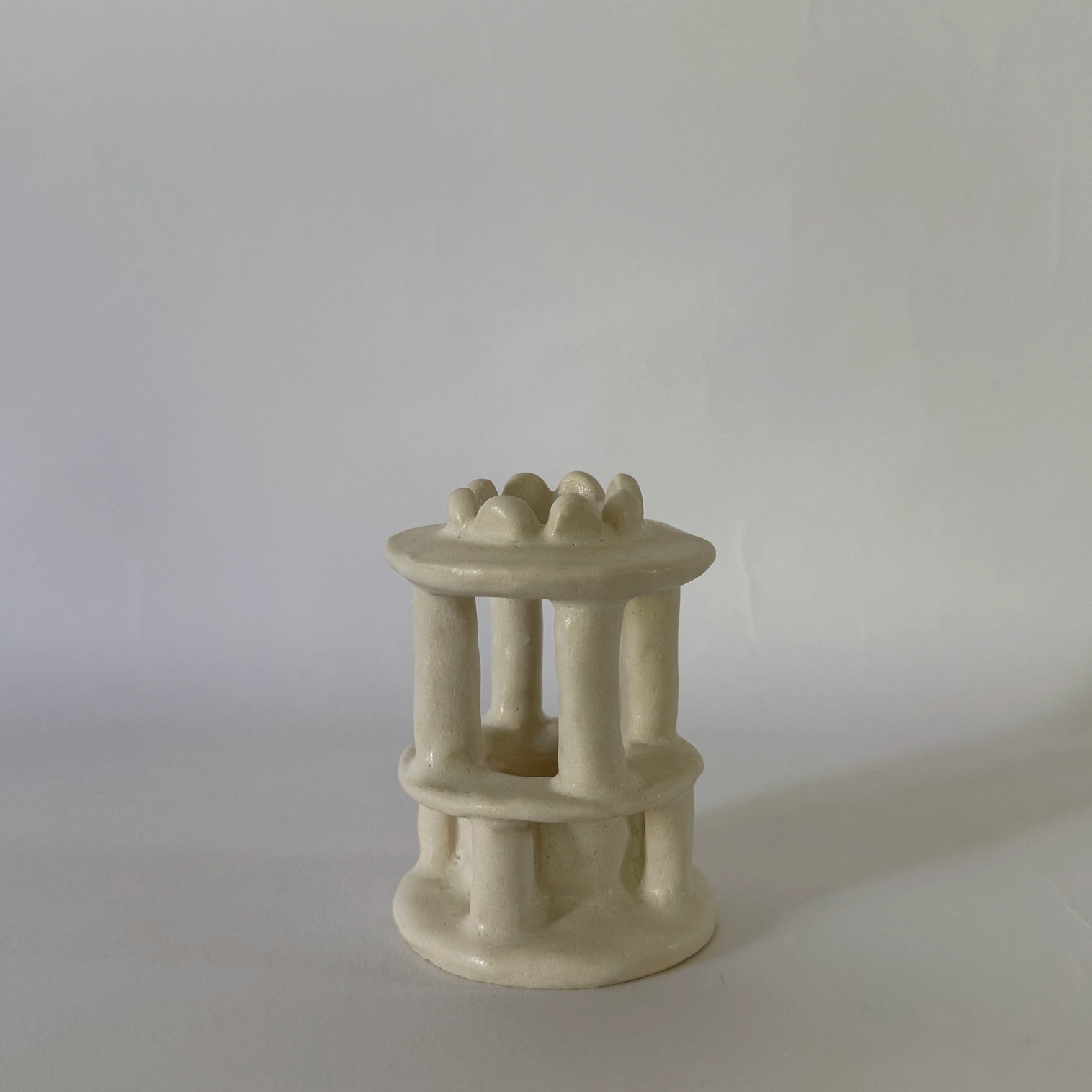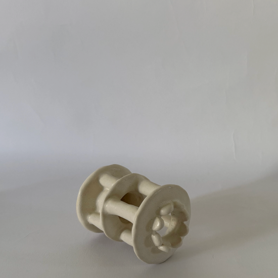 Hand built ceramic candleholder with soft white glaze. approximately 3"H x 2.25"W this piece is made to order and will ship in 3-6 weeks. because each pi5ece is built individually to order, it will vary slightly from what is pictured- as is the endearing nature of handmade.