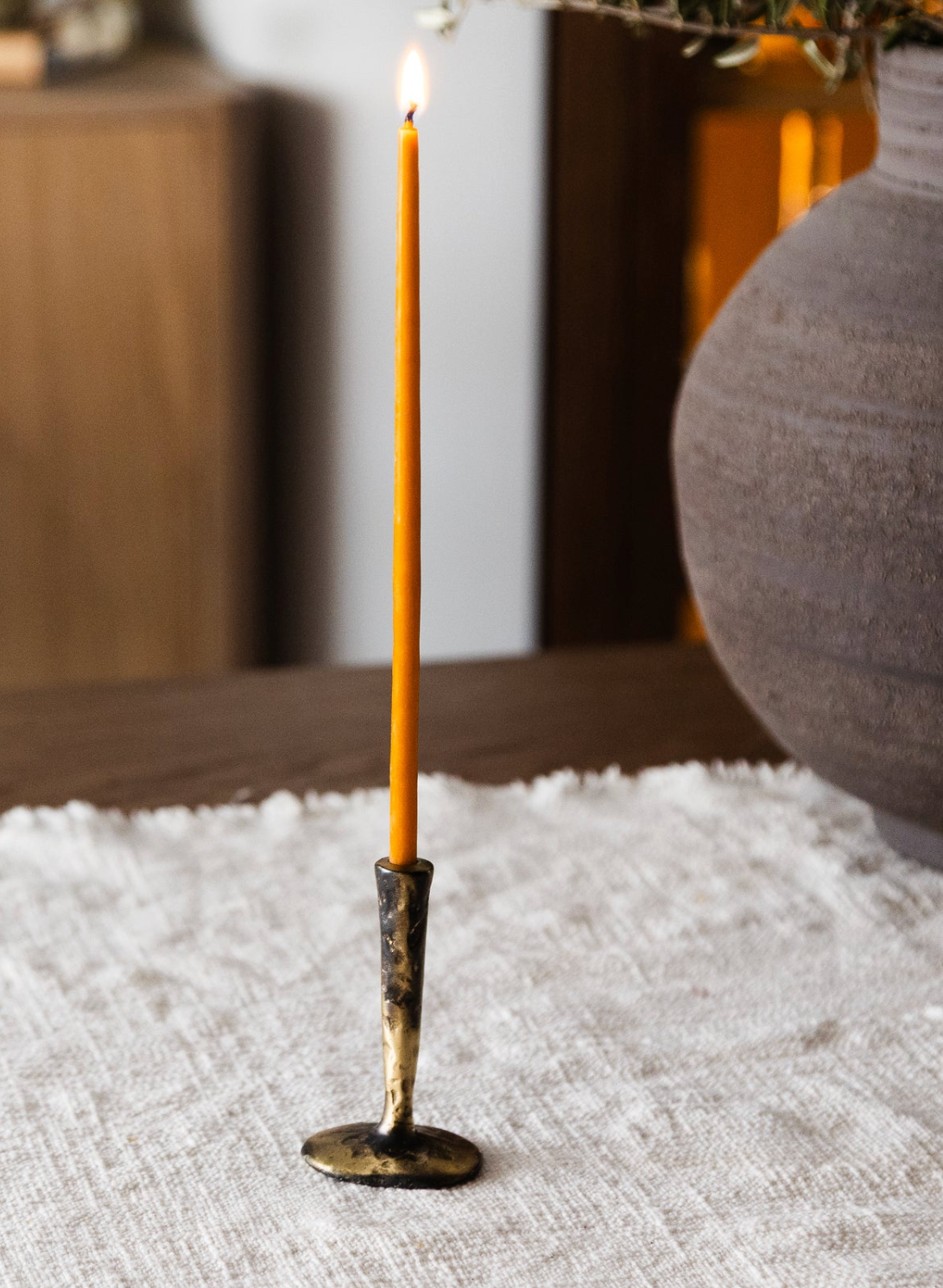 Our mini brass candlestick is hand-forged in northern Greece from solid brass, embodying the timeless traditions of the Byzantine era. Each piece is meticulously crafted with care, rooted in the rich heritage of the foundry’s native soil.