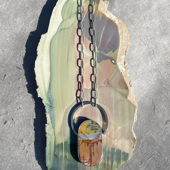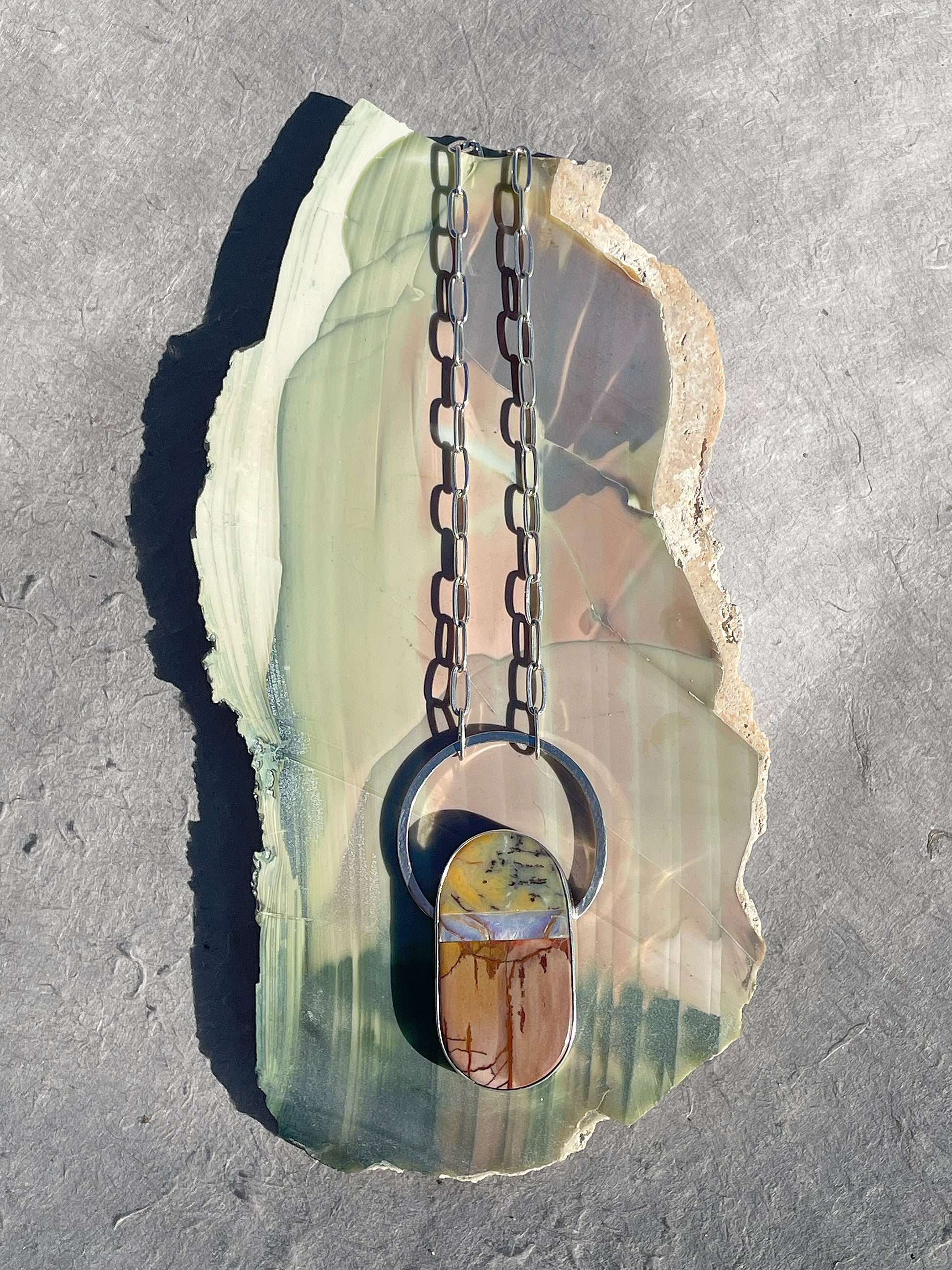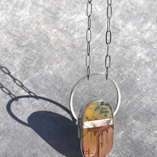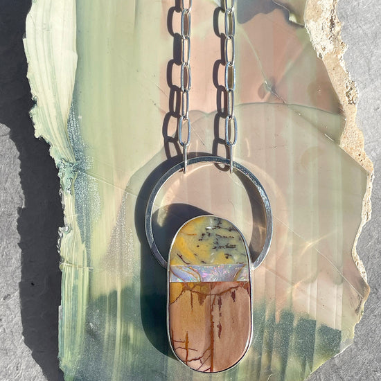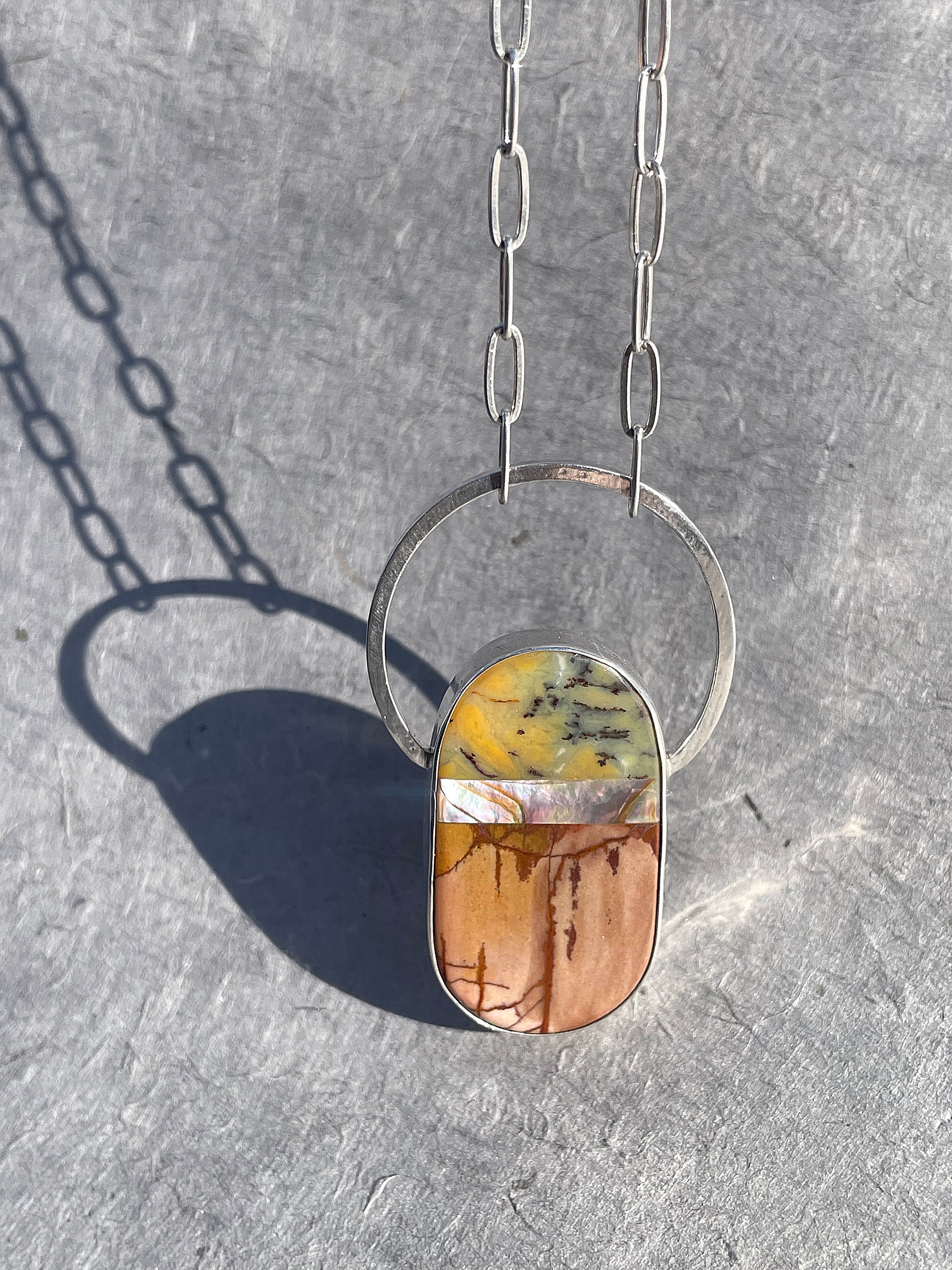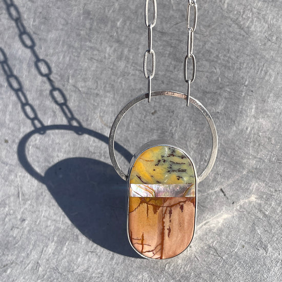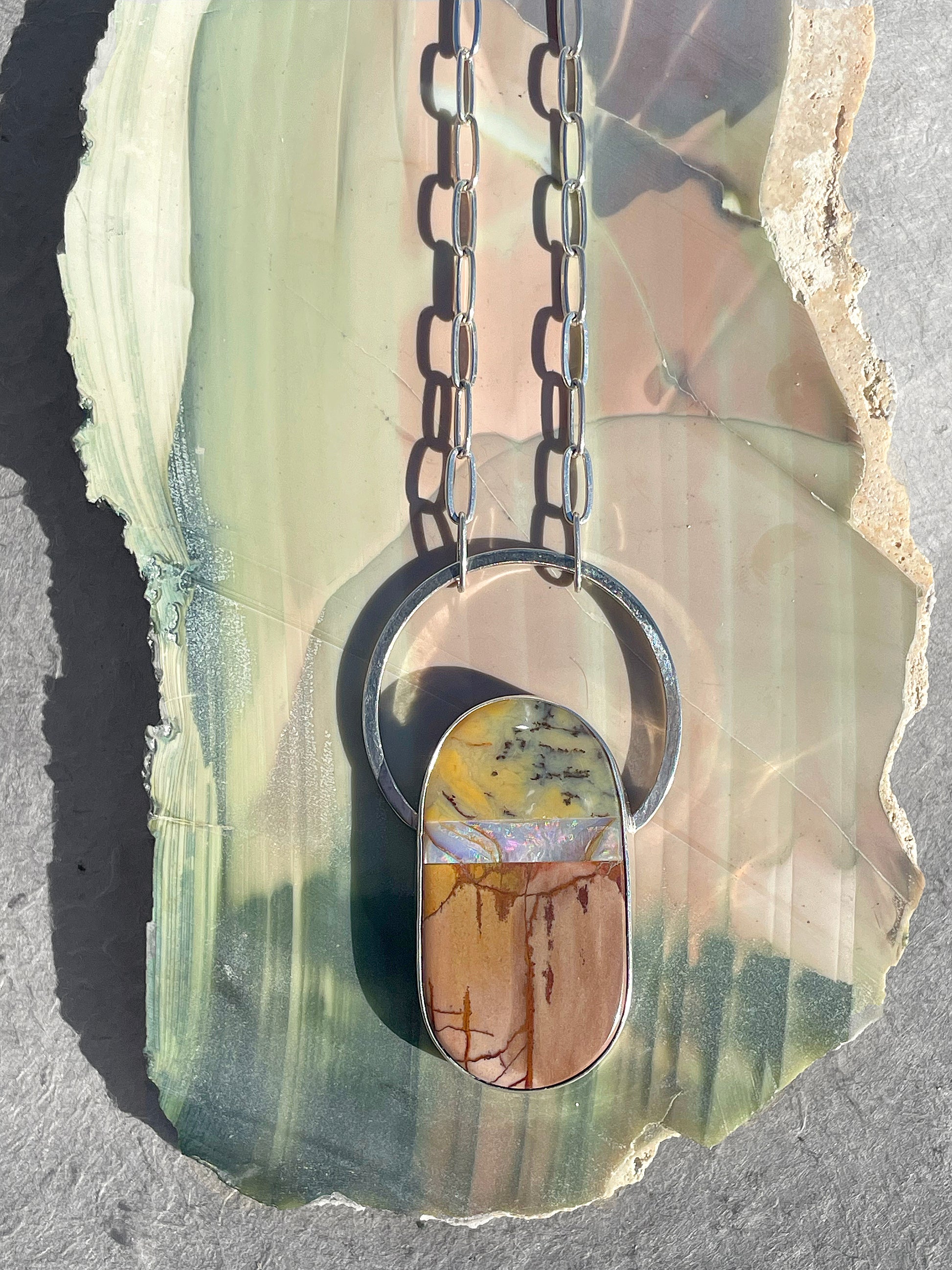 The Aurora Halo Capsule Necklace by Soledad Handmade features a luminous inlay of yellow jasper, pink abalone, and polychrome jasper, arranged in a soft circular “halo” form. Suspended on a 24" sterling silver chain (fastens shorter as desired), this piece feels both grounded and radiant. Finished with a secure lobster clasp. A quietly striking necklace that holds light, color, and warmth close to the heart.