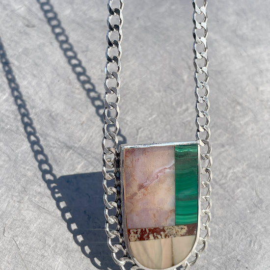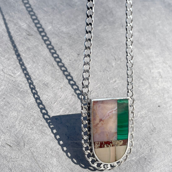 The Astoria Capsule Necklace by Soledad Handmade is a sculptural study in stone and shape. This handcrafted necklace by Soledad Handmade features an inverted arc intarsia inlay—earthy stones pieced together with quiet precision—set on a continuous curb chain. Elegant, grounded, and deeply tactile. Finished with a lobster clasp for ease and longevity.
