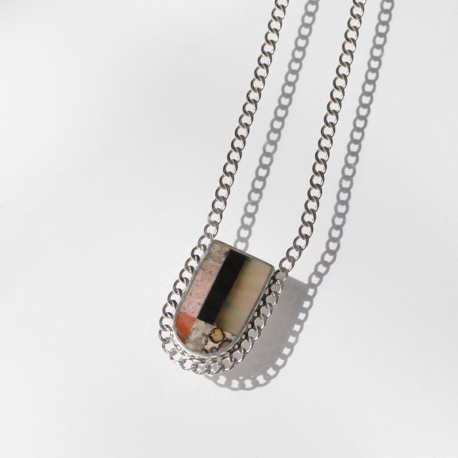 The Aurora Borealis Capsule Necklace by Soledad Handmade is a distinctive piece featuring an intarsia inlay pendant suspended from a continuous curb chain. The pendant showcases a harmonious blend of stones, meticulously set to evoke the mesmerizing hues of the northern lights. Crafted with precision, this necklace embodies both elegance and contemporary design.