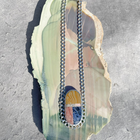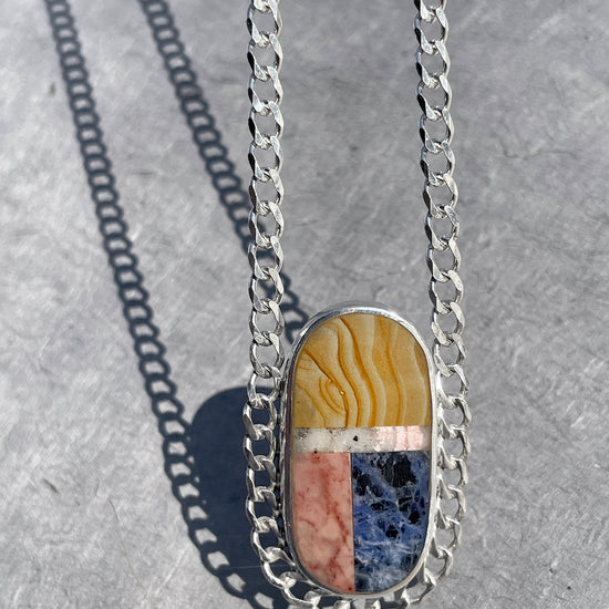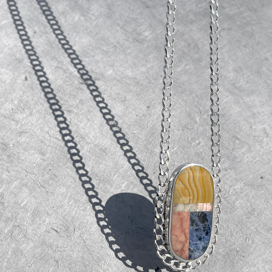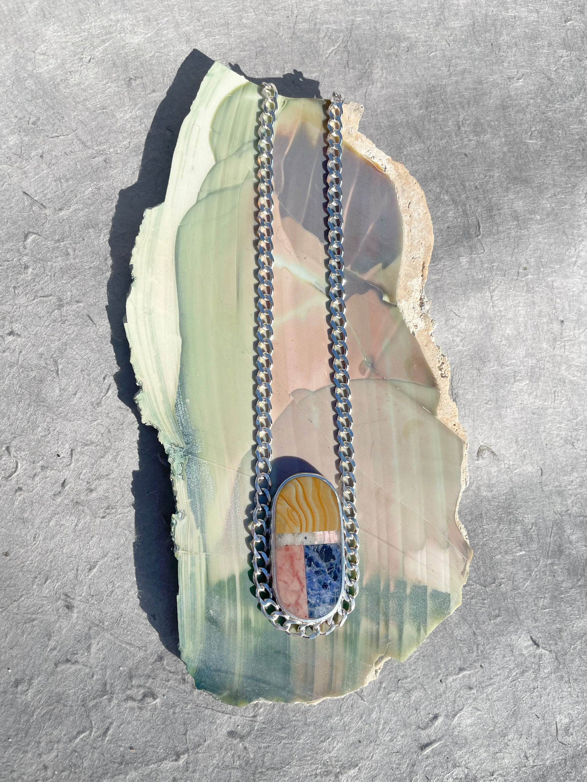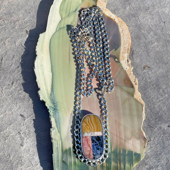 The Pismo Capsule Necklace — a grounded study in stone and form. Rhodonite, Owyhee Picture Jasper, and Sodalite inlaid by hand, set on a substantial 24" sterling silver chain. A piece that feels warm, lived-in, and deeply held.