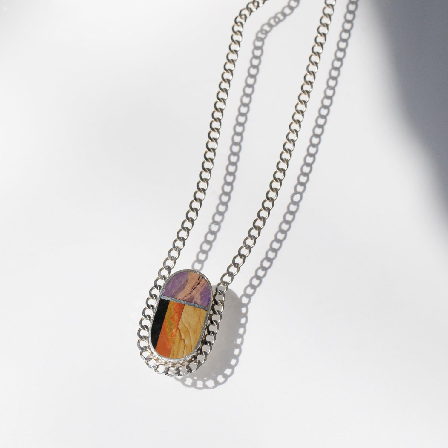 Inspired by the quiet transition of day into night, the Dusk Capsule Necklace by Soledad Handmade captures the moody elegance of twilight. Handcrafted with precision, the capsule-shaped pendant features a striking intarsia inlay of natural stones, each piece reflecting the layered hues of a fading sky.